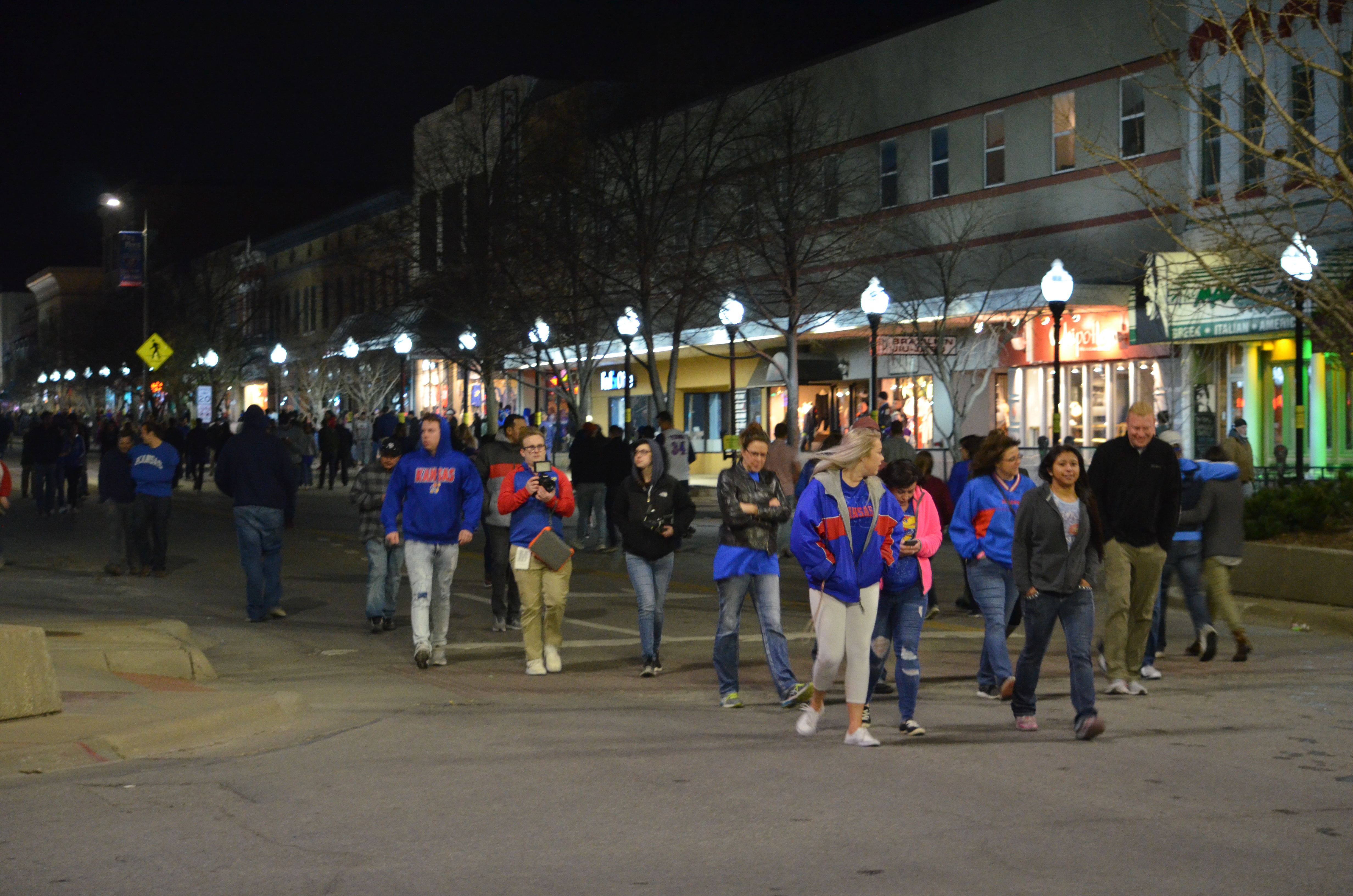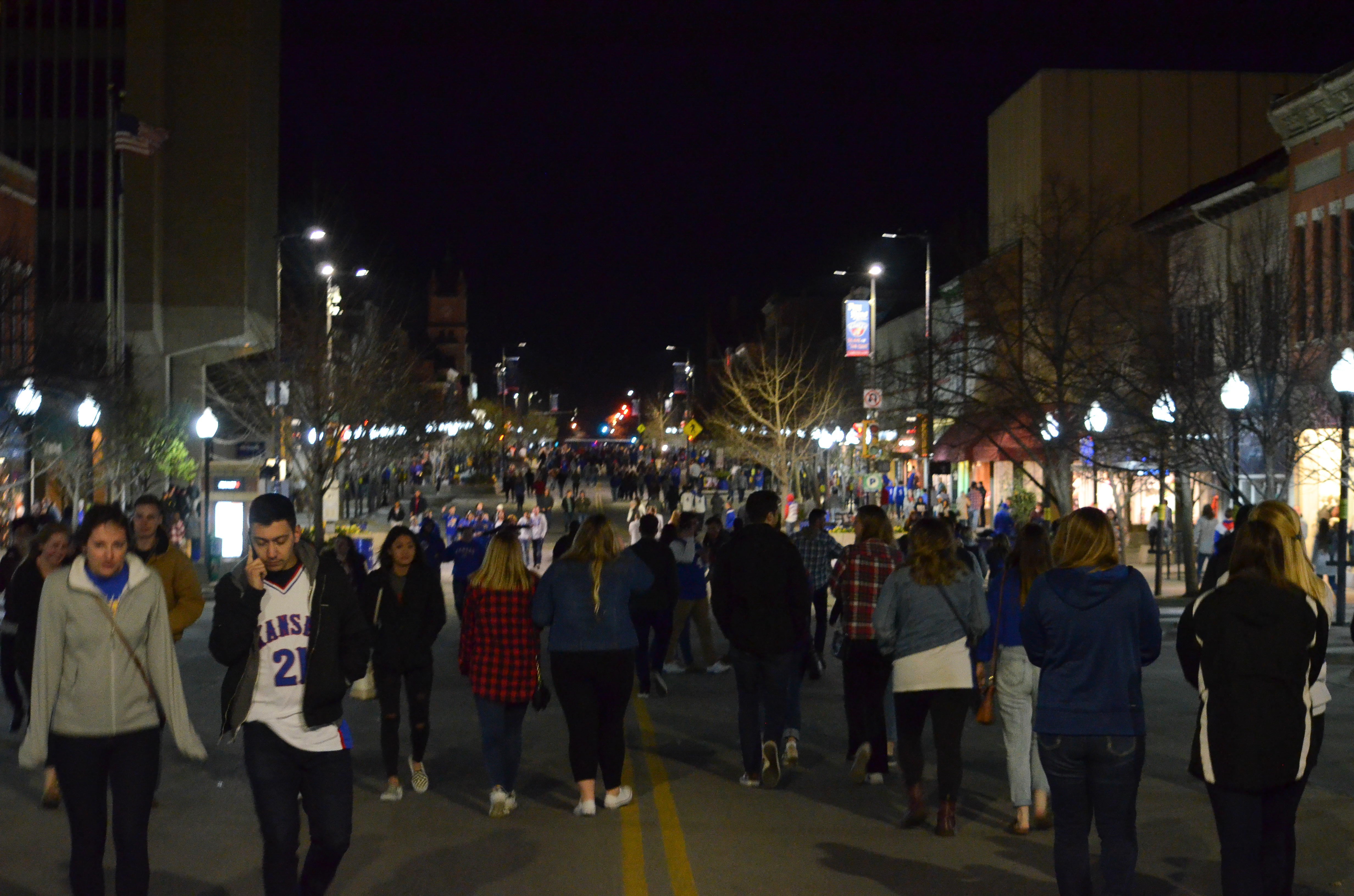 Kansas basketball fans walk on Massachusetts Street after the Jayhawks played in the Final Four on Saturday, March 31, 2018. The city closed the street to traffic and parking temporarily. KU lost to Villanova, 95-79.