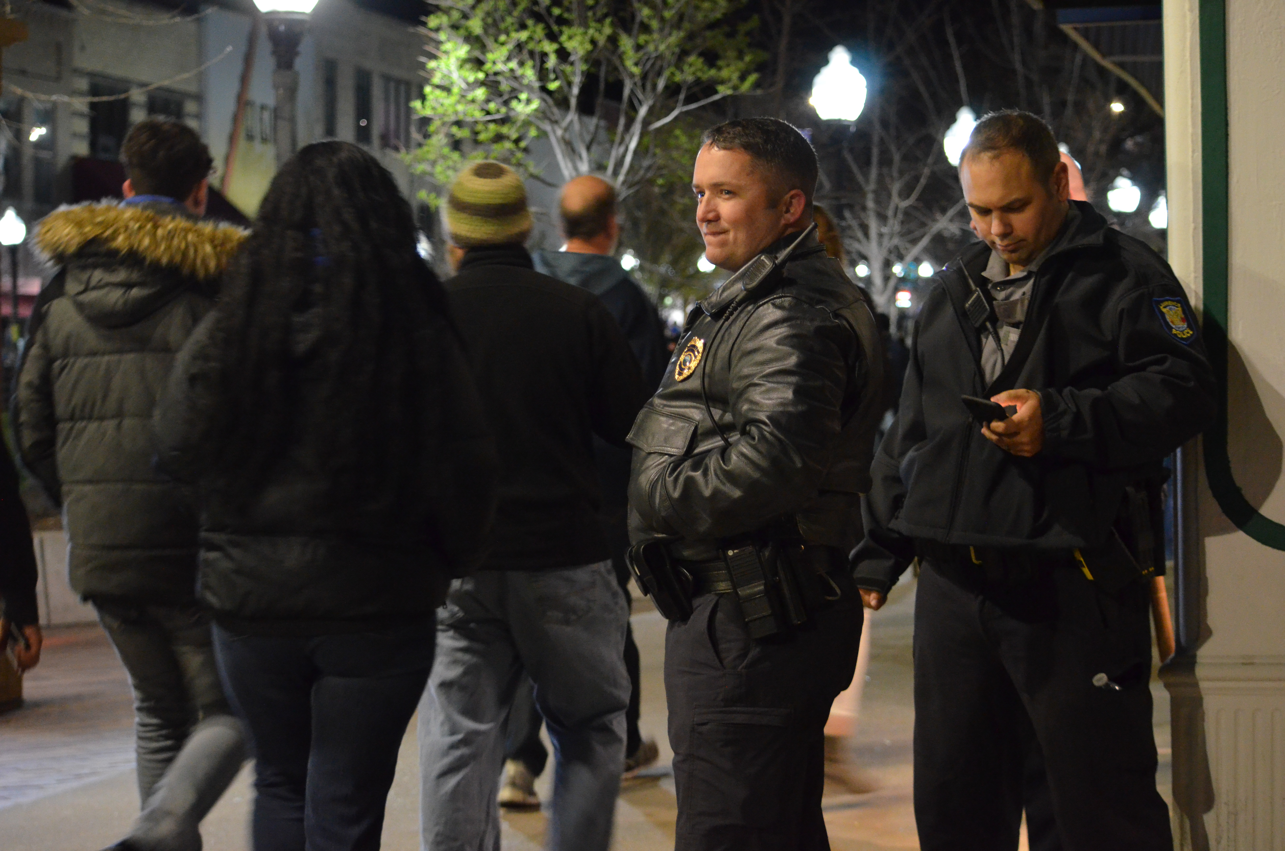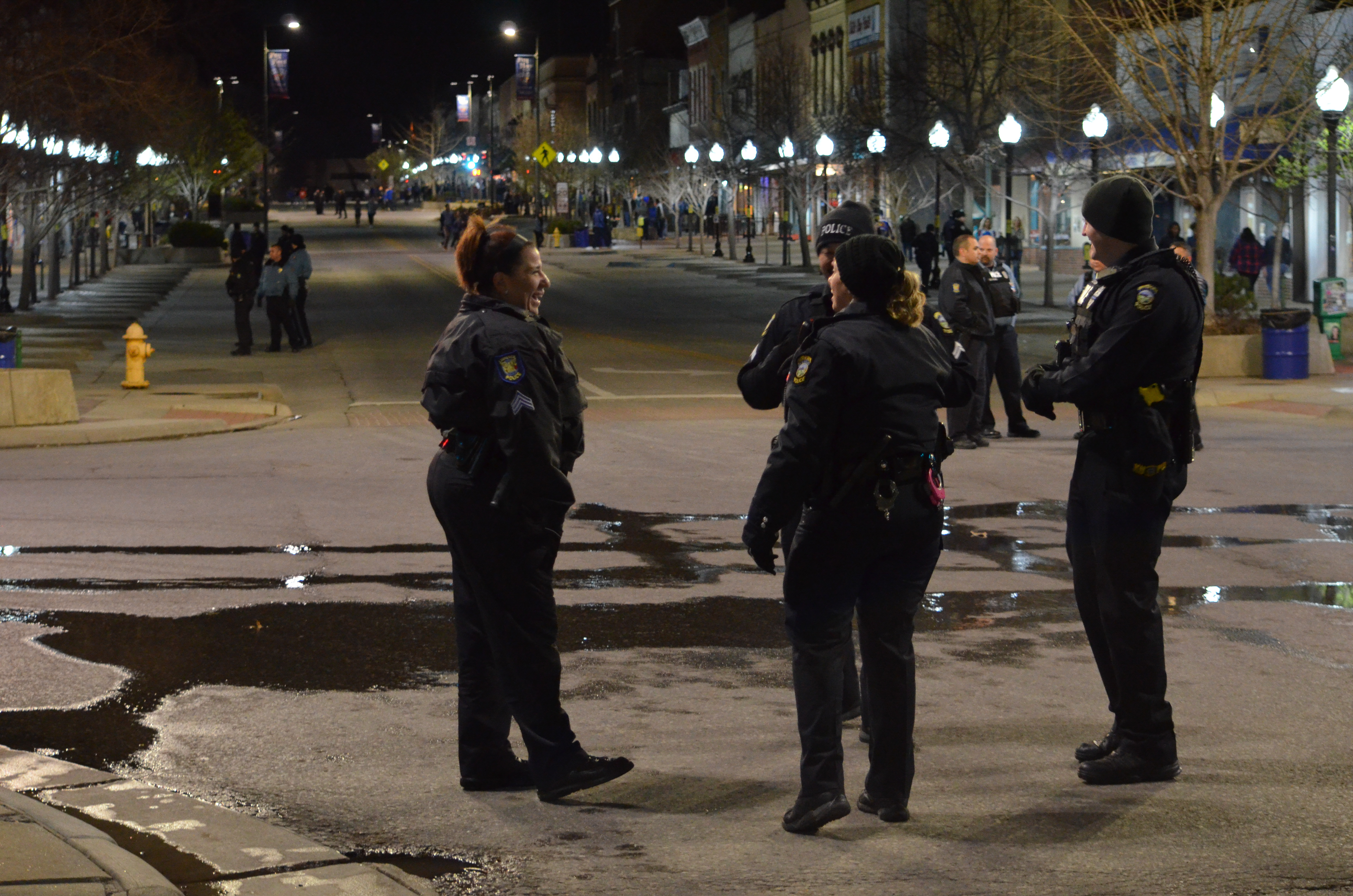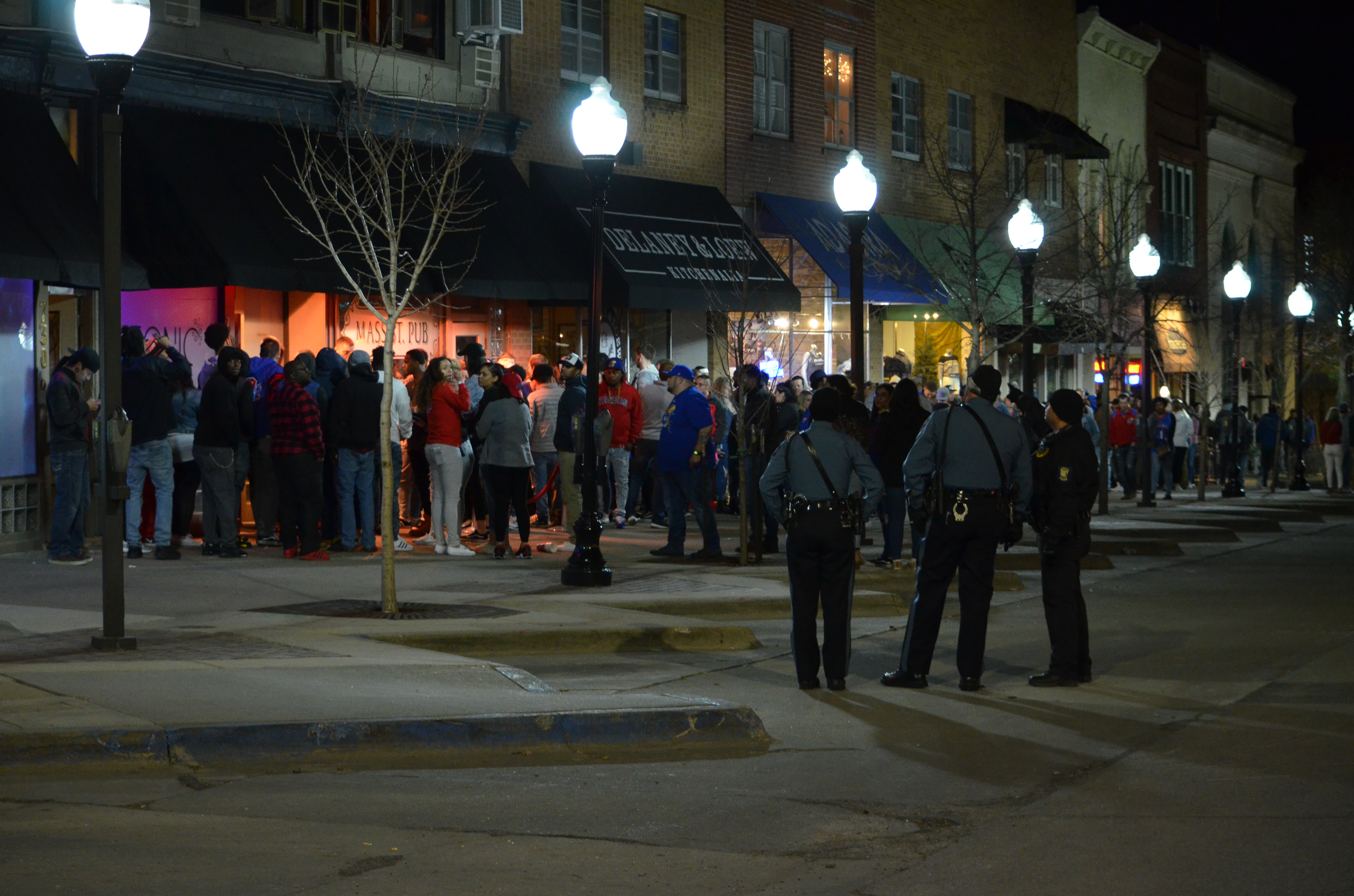 Police monitor Massachusetts St. after the Jayhawks played in the Final Four on Saturday, March 31, 2018. The city closed the street to traffic and parking temporarily. KU lost to Villanova, 95-79.