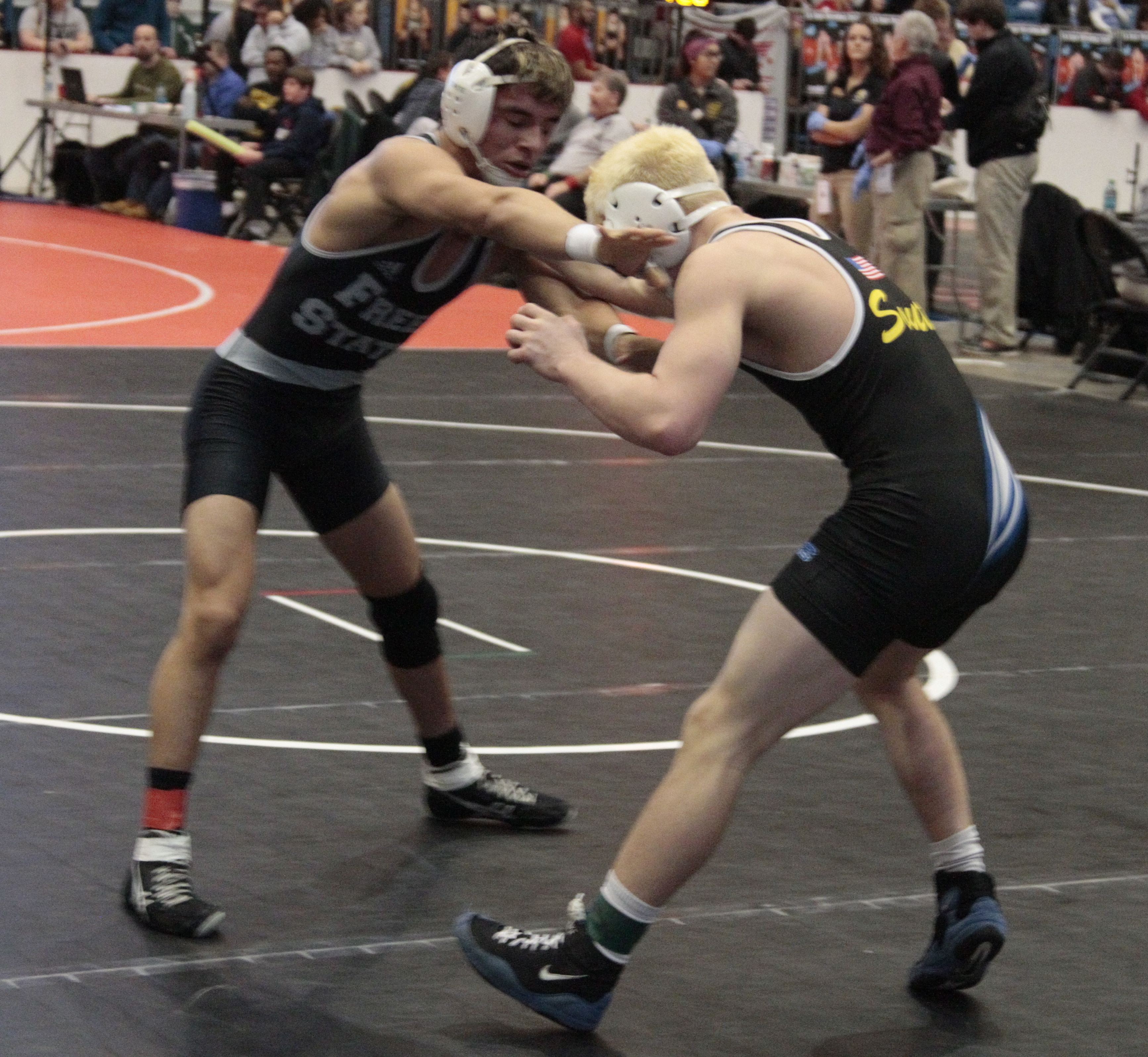 Free State's Joey Eddis tries to shake free of Olathe North's McCoy Stoker at the Class 6A state wrestling tournament on Feb. 25, 2018 at Hartman Arena in Park City.