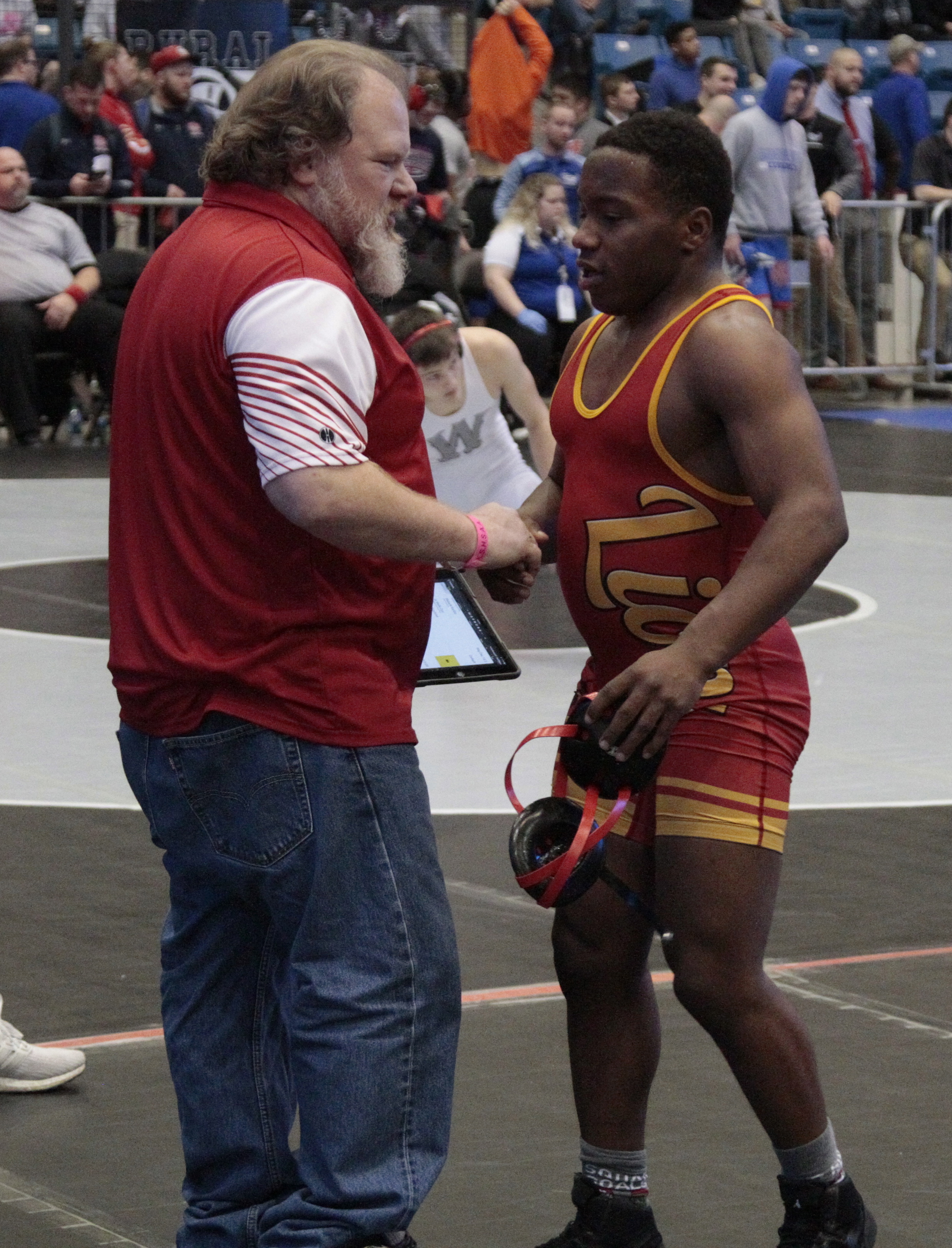 Lawrence High wrestling coach Pat Naughton congratulates senior Relle Dye after winning his third-place match at the Class 6A state wrestling tournament on Saturday at Hartman Arena in Park City.