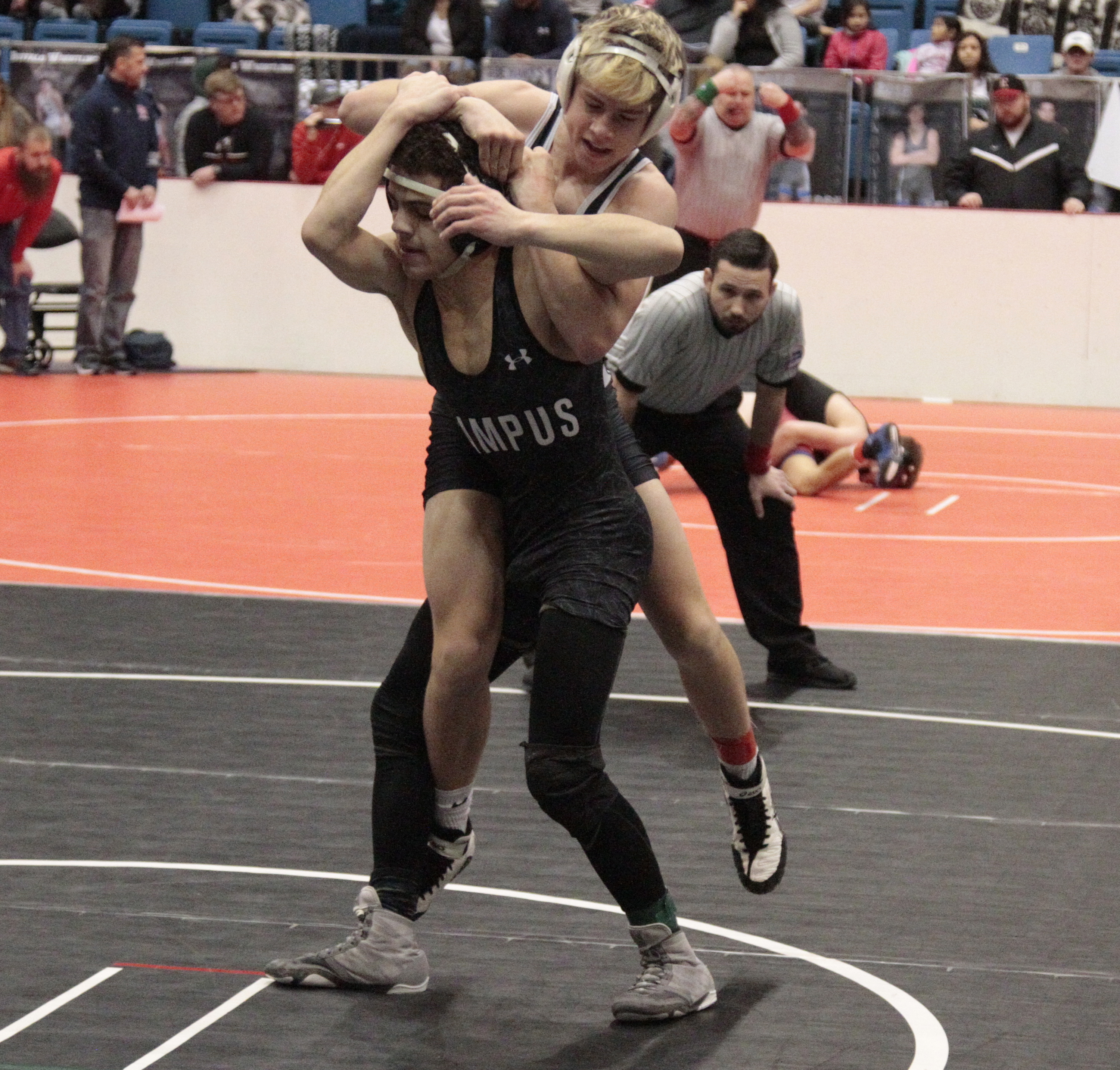 Free State's Garrett Bradley hangs on the back of Haysville-Campus' Derek Journey at the Class 6A state wrestling tournament on Saturday at Hartman Arena in Park City.