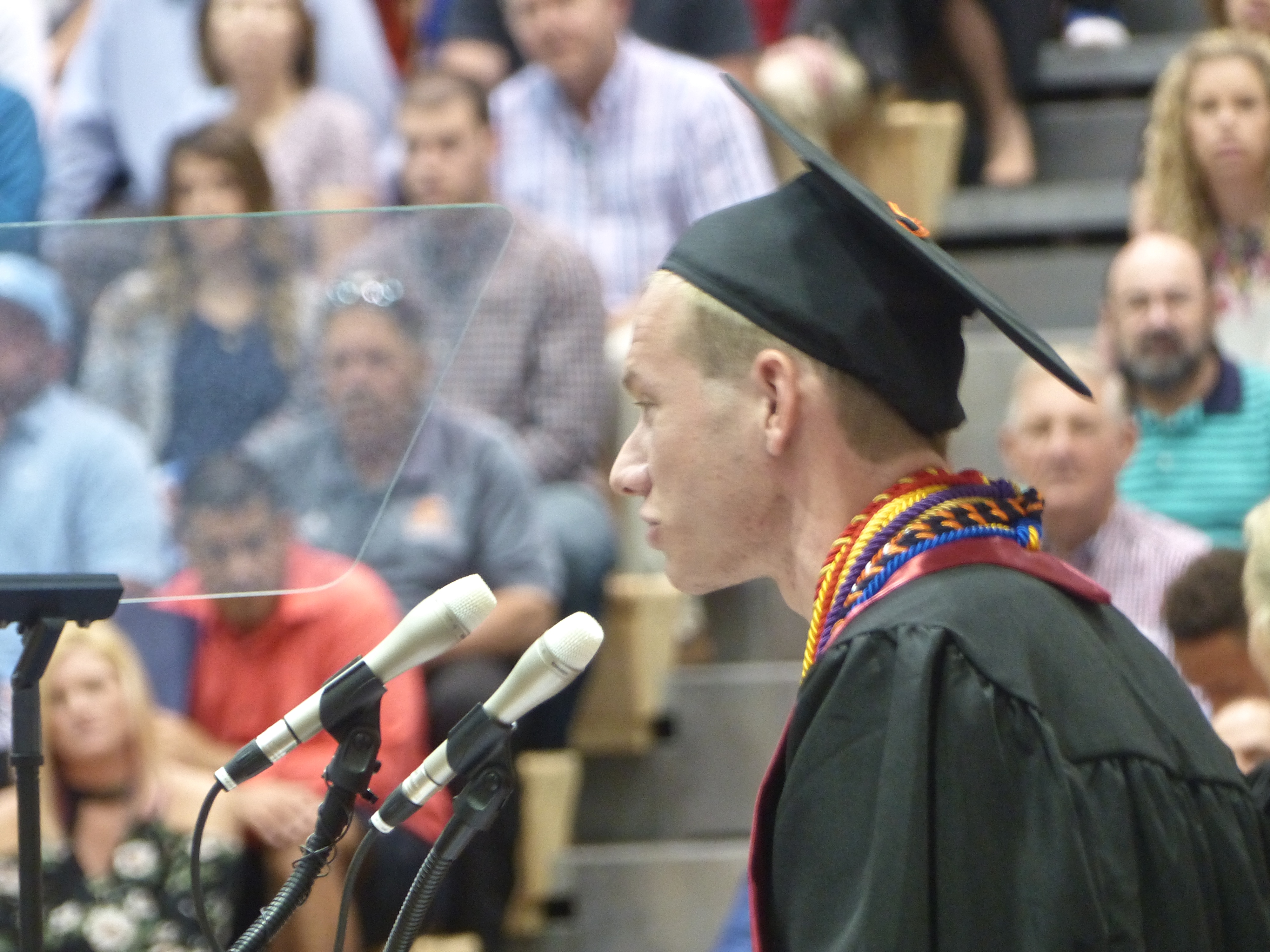 Baker University senior class President Spencer Brown addresses his fellow graduates Sunday, May 20, 2018 during the school's spring commencement. Brown was one of three graduates recognized as outstanding seniors, along with Logan Brettell and Brenda McCollum.