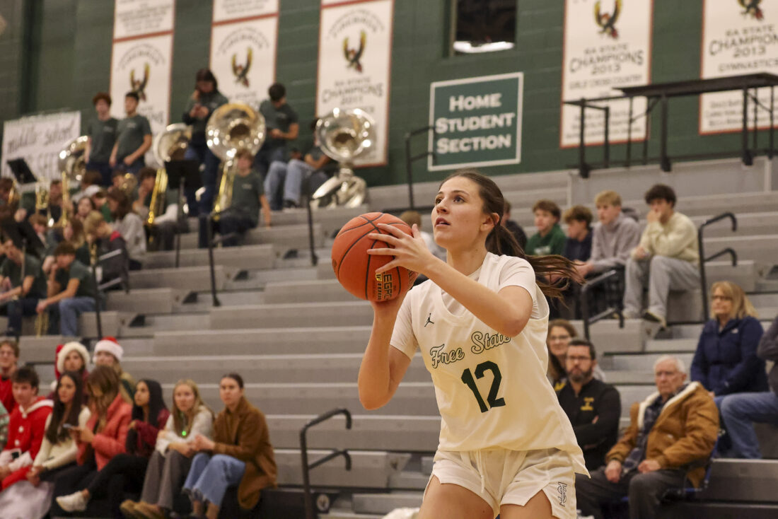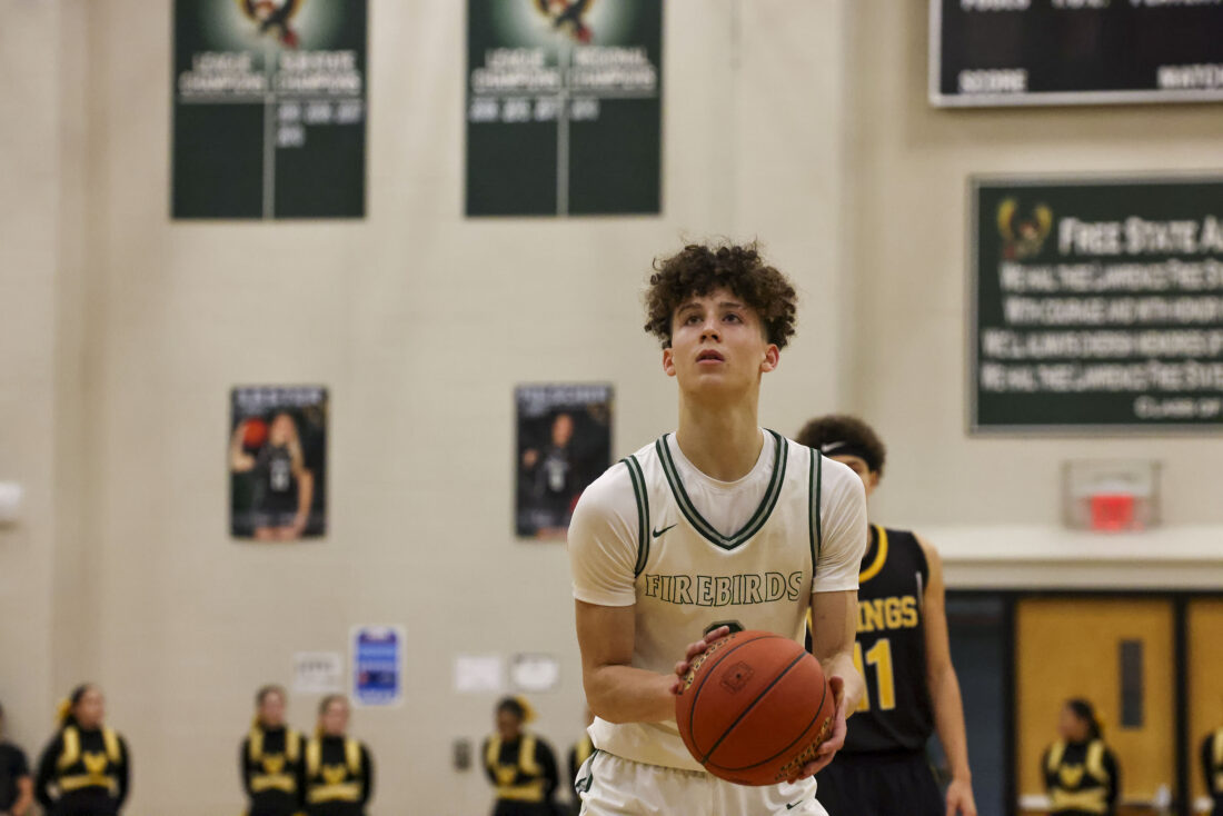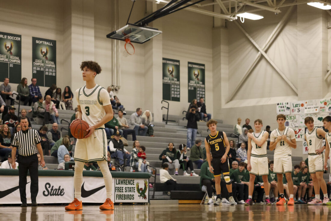 Free State sophomore Brenden Barrett starts the Firebirds game against Shawnee Mission West shooting technical free throws on Friday, Dec. 19, 2025, at Free State High School in Lawrence.