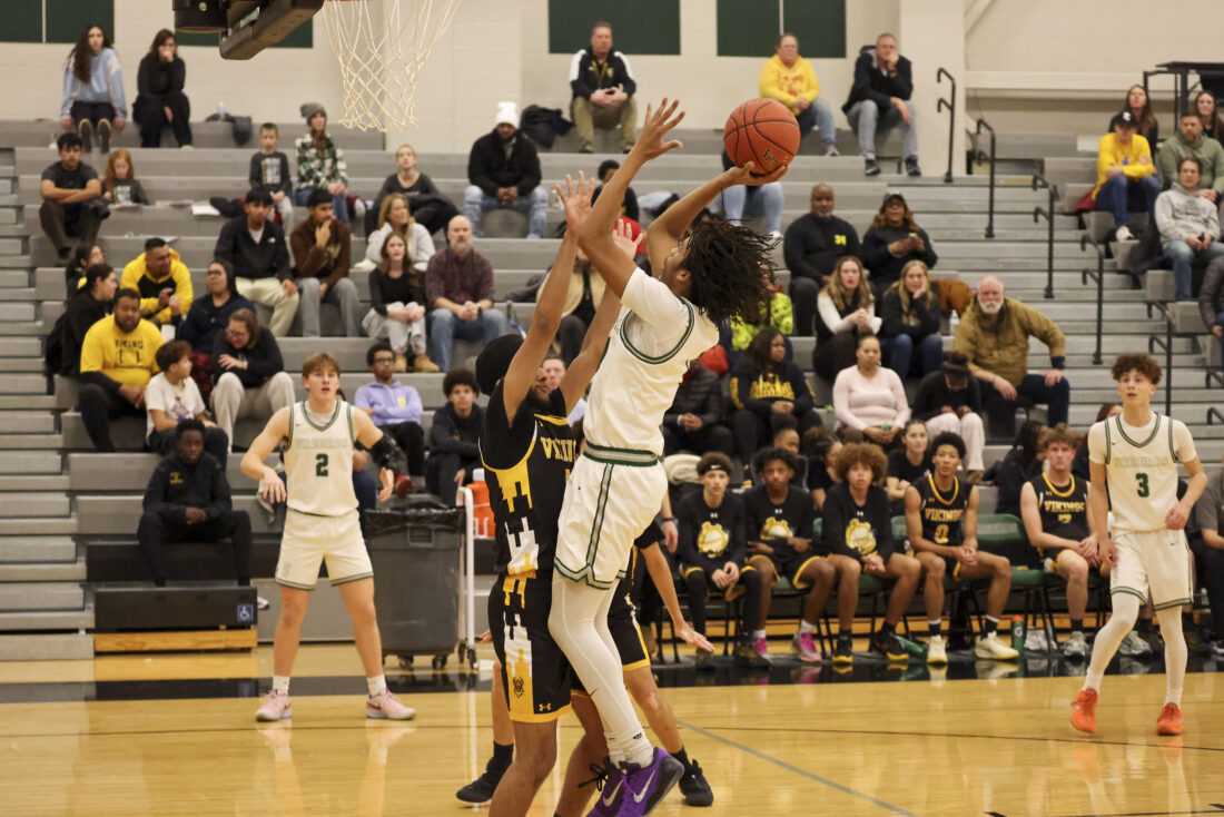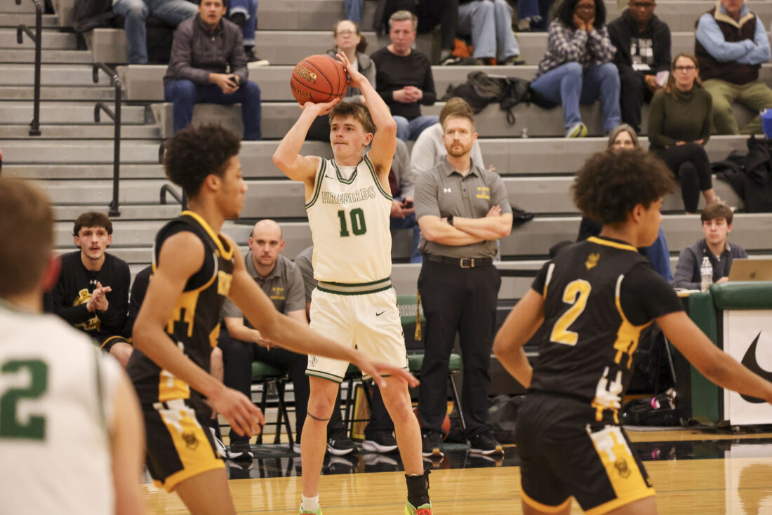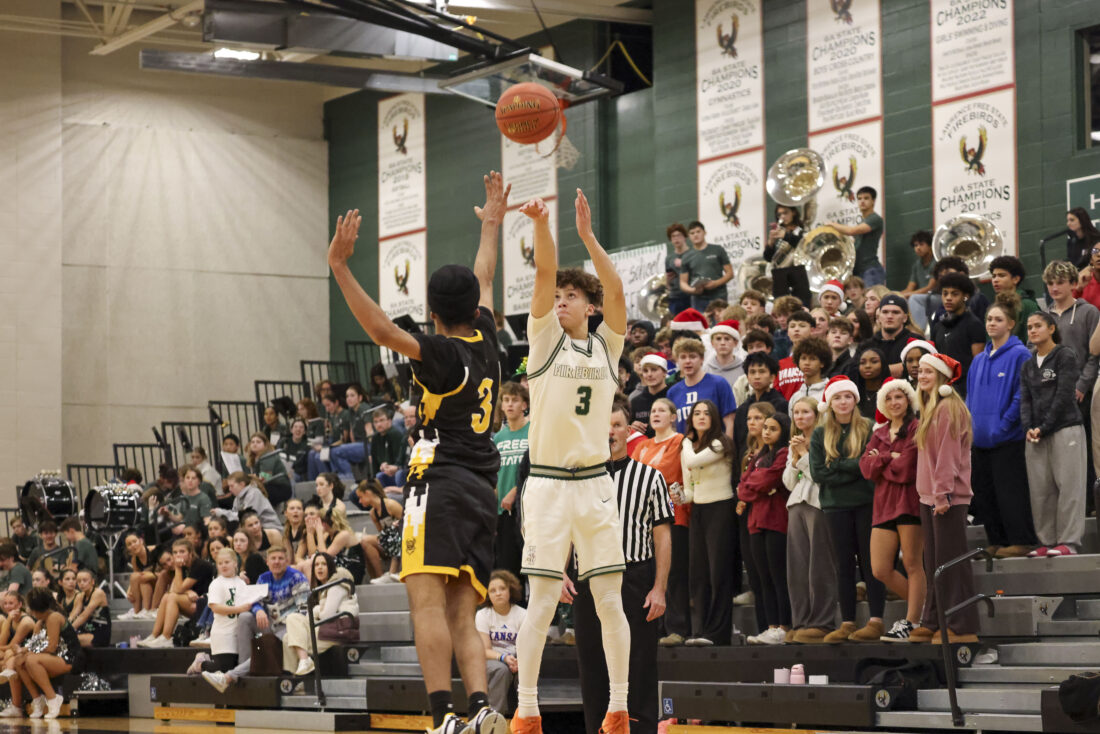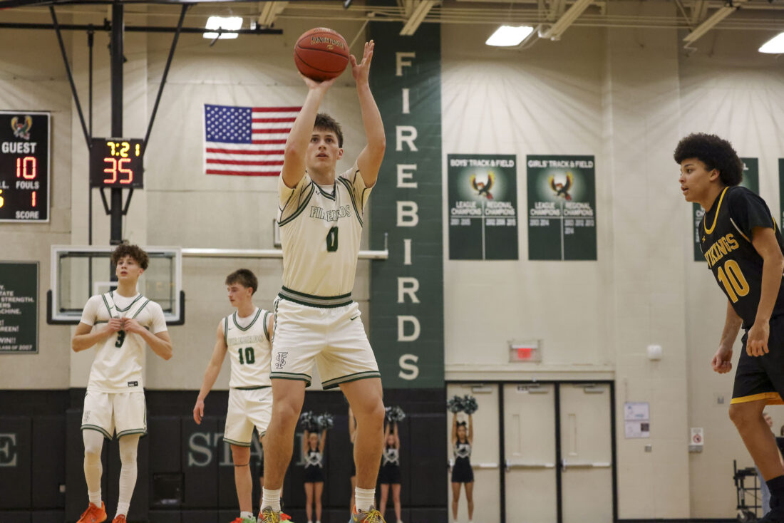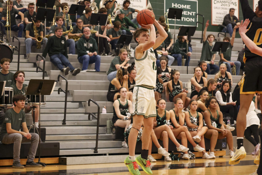 Free State sophomore Brenden Barrett fires a three over the hands of a leaping Shawnee Mission West defender during the Firebirds’ game on Friday, Dec. 19, 2025, at Free State High School in Lawrence.