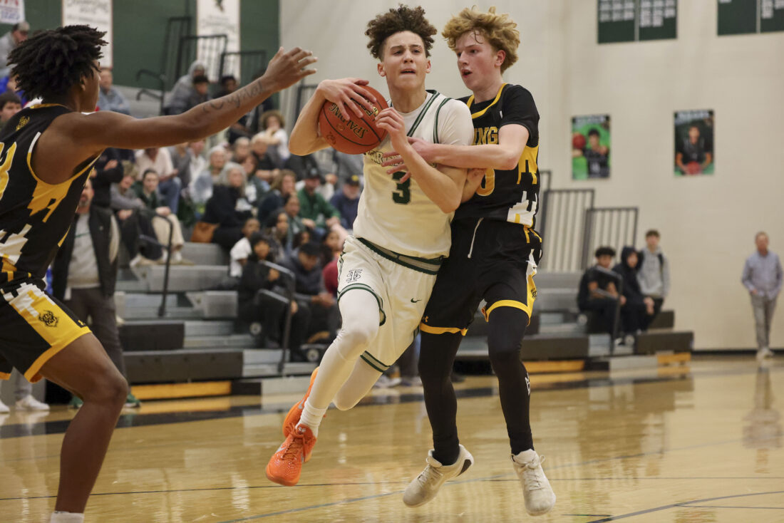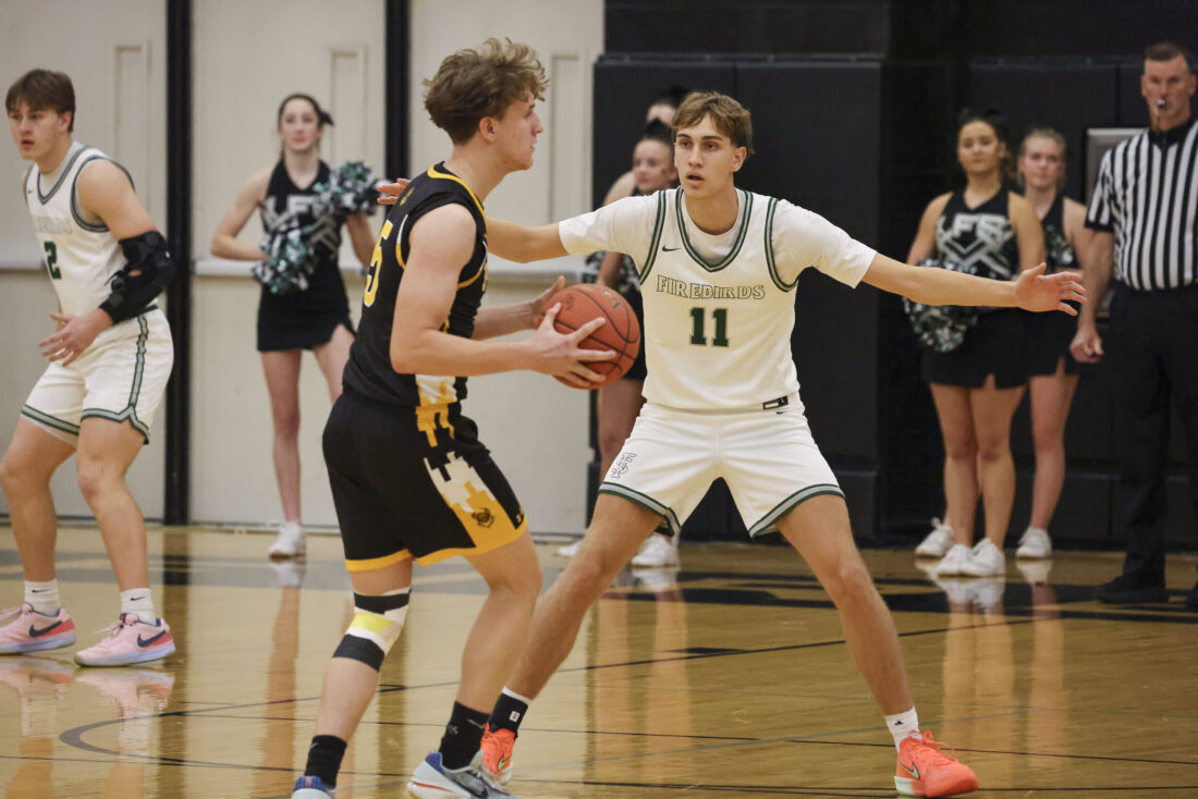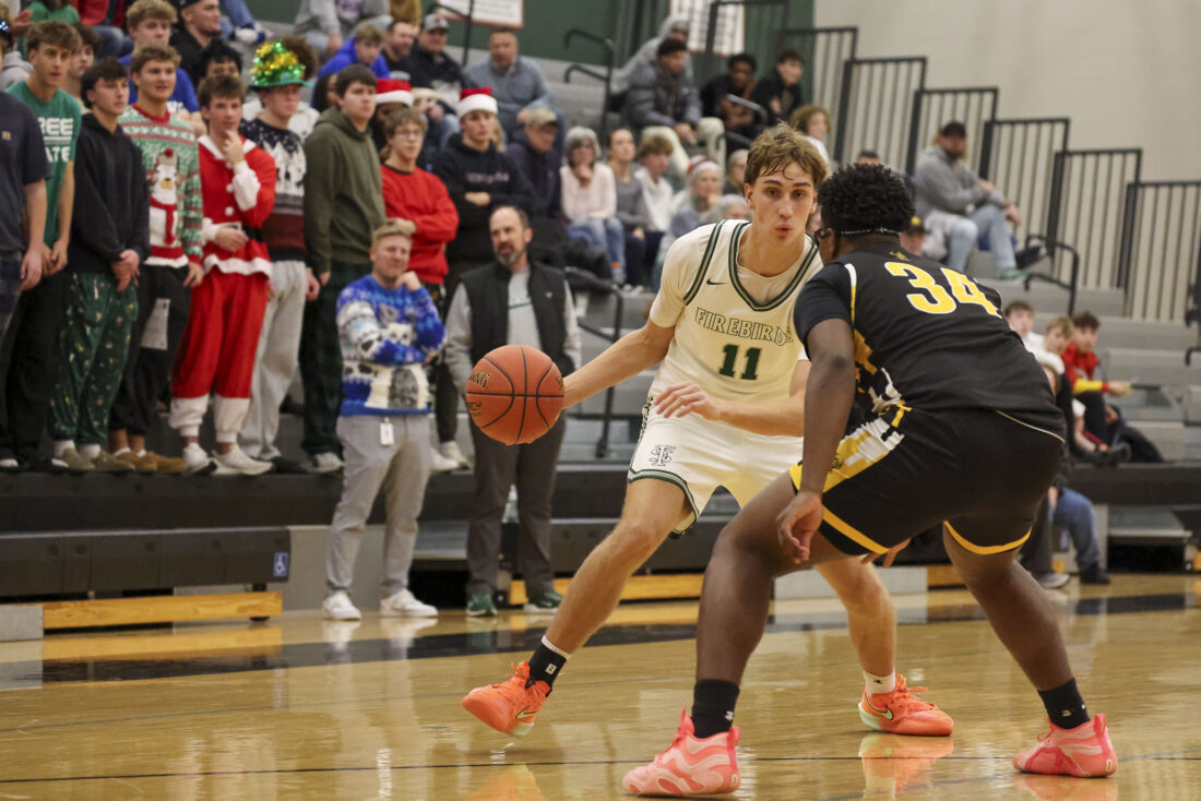 Free State senior Bennett Nagel stays in front of a Shawnee Mission West ball handler during the Firebirds’ game on Friday, Dec. 19, 2025, at Free State High School in Lawrence.