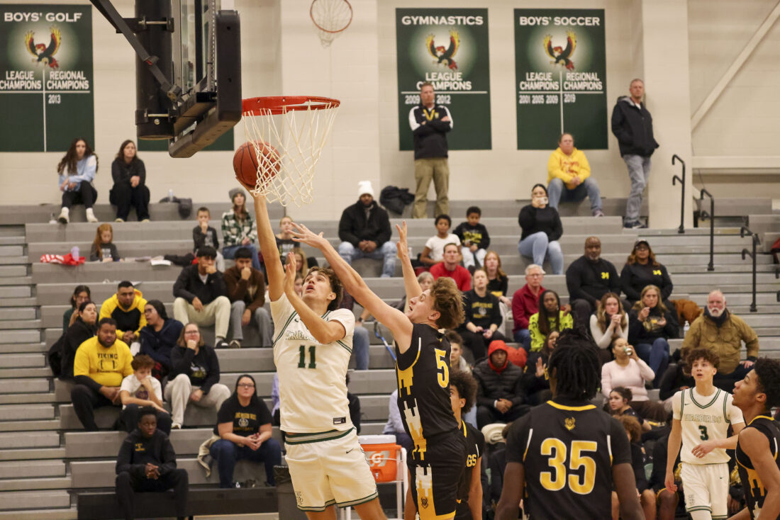 Free State sophomore Brenden Barrett is fouled while driving to the basket during the Firebirds’ game against Shawnee Mission West on Friday, Dec. 19, 2025, at Free State High School in Lawrence.
