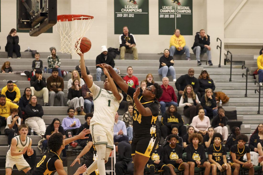 Free State sophomore Jayden Williams makes it past his defender for a layup during the Firebirds’ game against Shawnee Mission West on Friday, Dec. 19, 2025, at Free State High School in Lawrence.