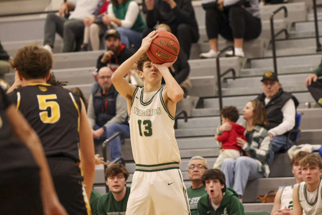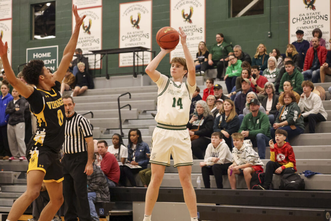 Free State junior Owen Garber shoots a three during the Firebirds’ game against Shawnee Mission West on Friday, Dec. 19, 2025, at Free State High School in Lawrence.