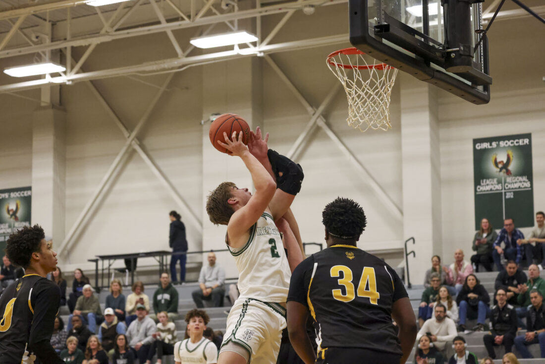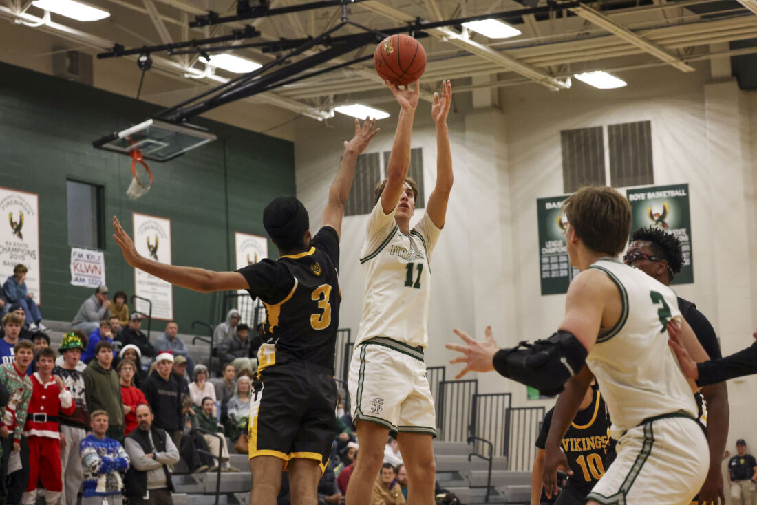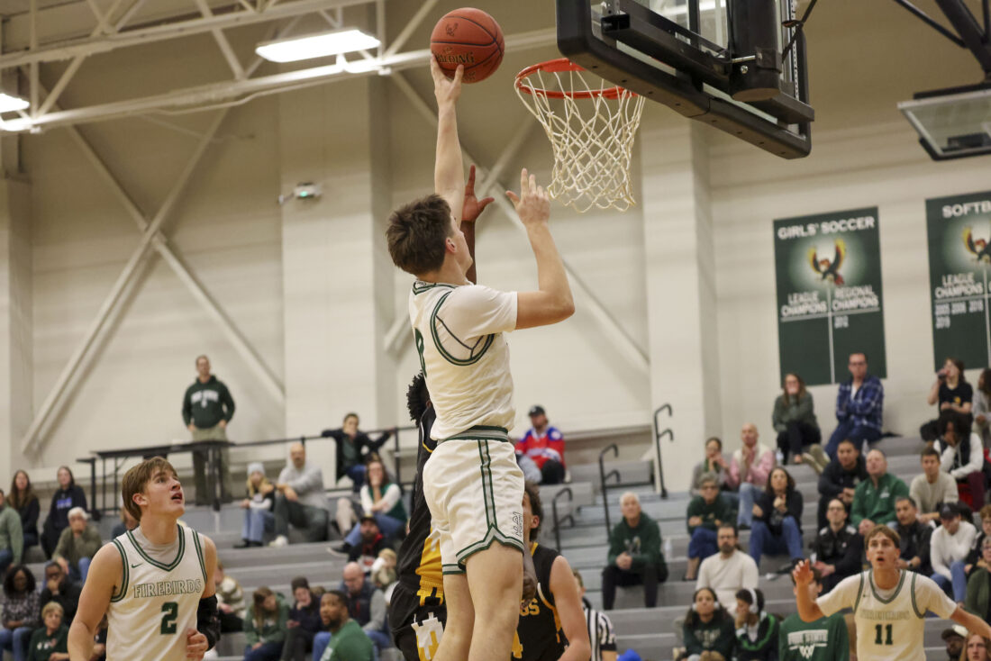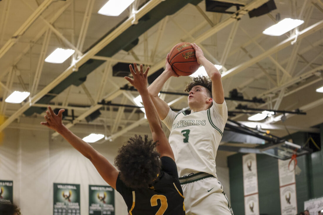 Free State senior Bennett Nagel shoots over the Shawnee Mission West defense during the Firebirds’ game on Friday, Dec. 19, 2025, at Free State High School in Lawrence.