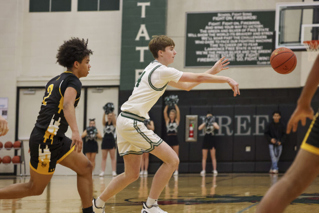 Free State junior Owen Garber skips a pass during the Firebirds’ game against Shawnee Mission West on Friday, Dec. 19, 2025, at Free State High School in Lawrence.