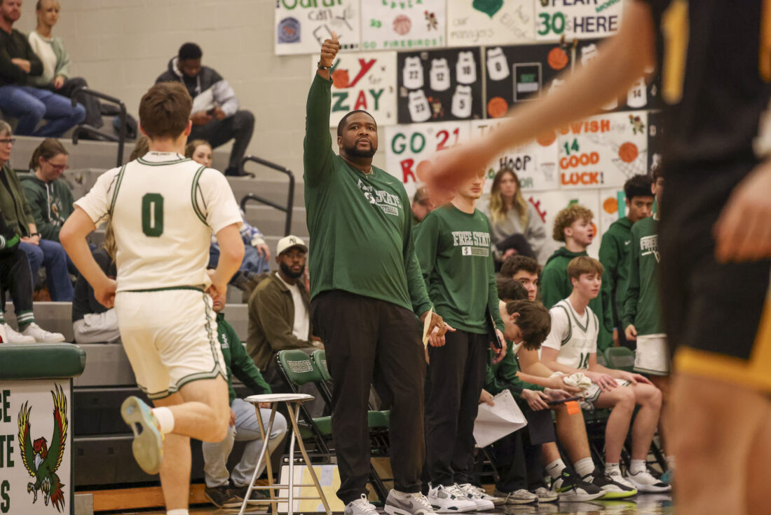 Free State head coach Dwayne Paul signals a formation to his team during the Firebirds’ game against Shawnee Mission West on Friday, Dec. 19, 2025, at Free State High School in Lawrence.