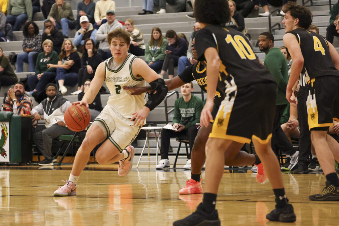 Free State senior Ethan Prescott dribbles around his defender during the Firebirds’ game against Shawnee Mission West on Friday, Dec. 19, 2025, at Free State High School in Lawrence.