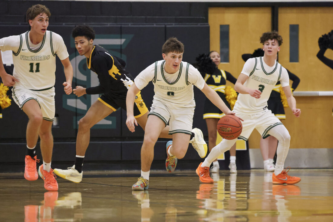 Free State freshman Packson McDaniel charges down the court during the Firebirds’ game against Shawnee Mission West on Friday, Dec. 19, 2025, at Free State High School in Lawrence.