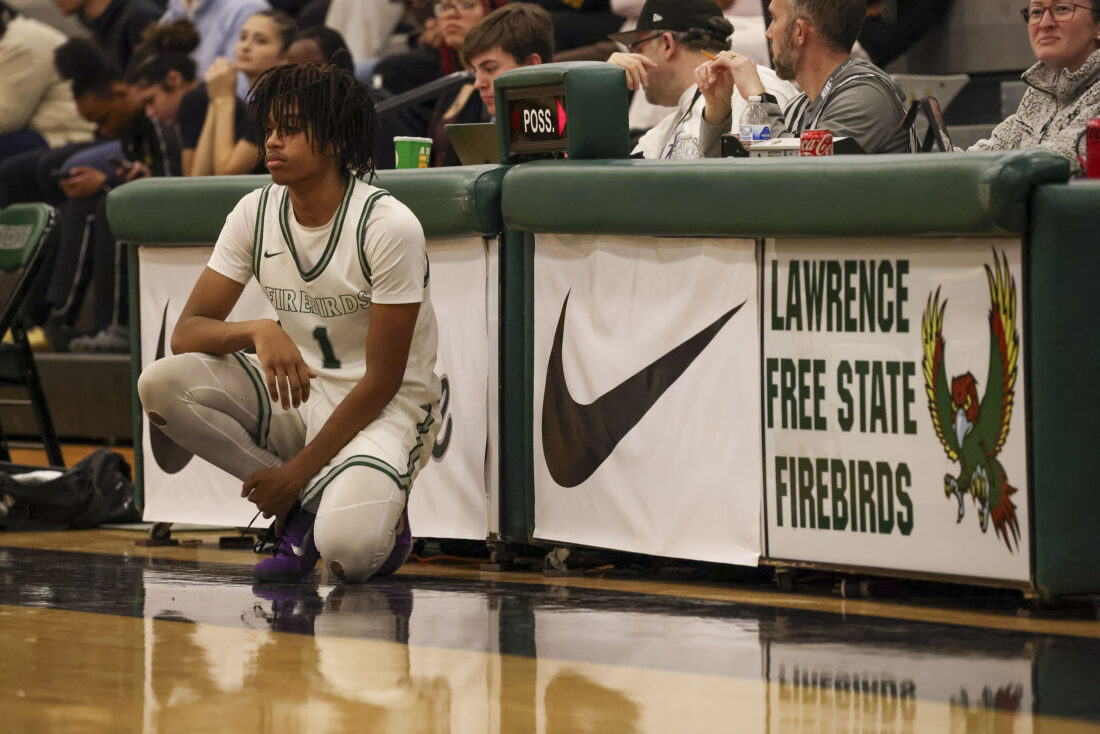 Free State sophomore Jayden WIlliams waits to check in during the Firebirds’ game against Shawnee Mission West on Friday, Dec. 19, 2025, at Free State High School in Lawrence.