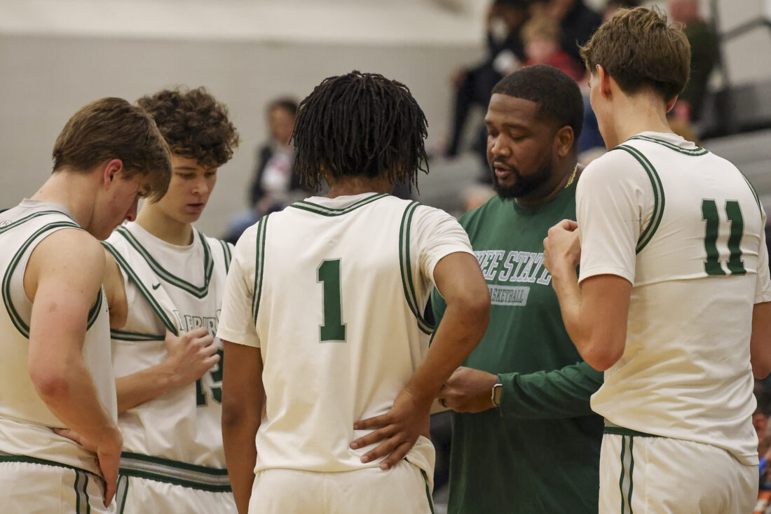 The Free State boy’s basketball team huddles during the Firebirds’ game against Shawnee Mission West on Friday, Dec. 19, 2025, at Free State High School in Lawrence.