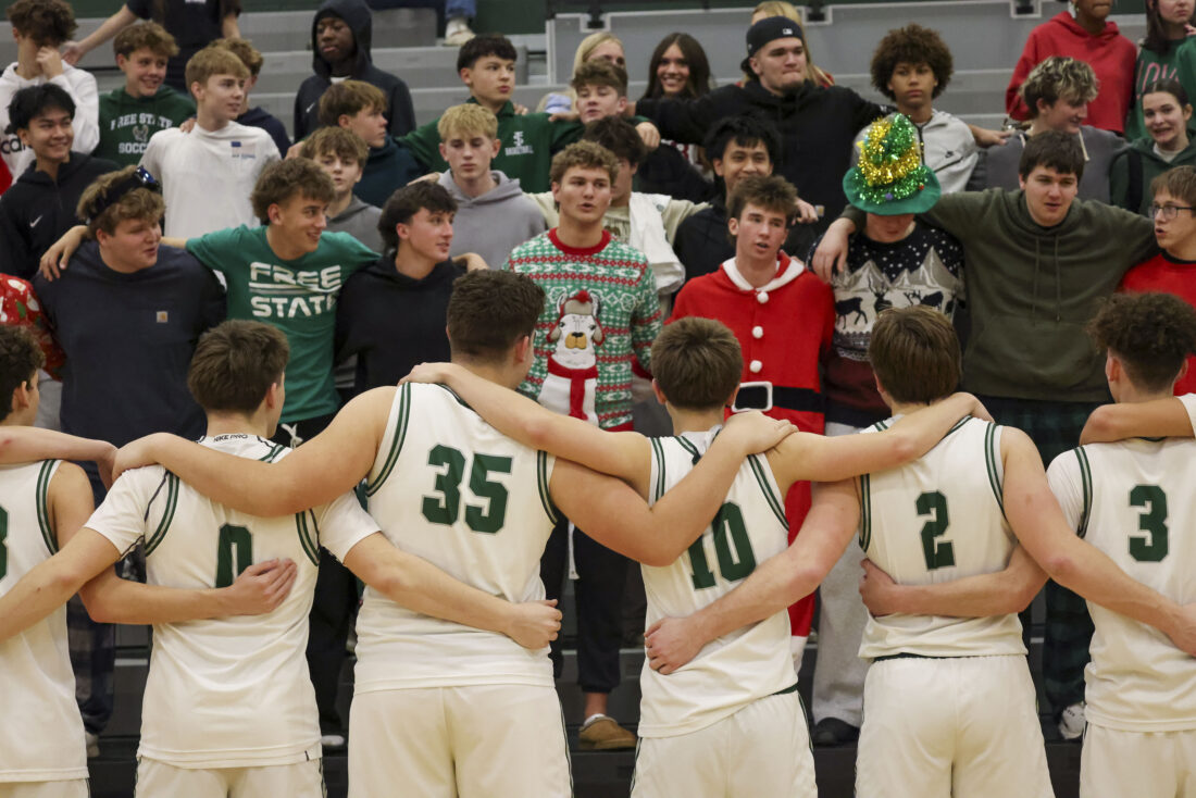 The Free State boy’s basketball team celebrates their win with the student section after their game against Shawnee Mission West on Friday, Dec. 19, 2025, at Free State High School in Lawrence.