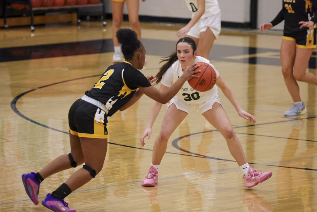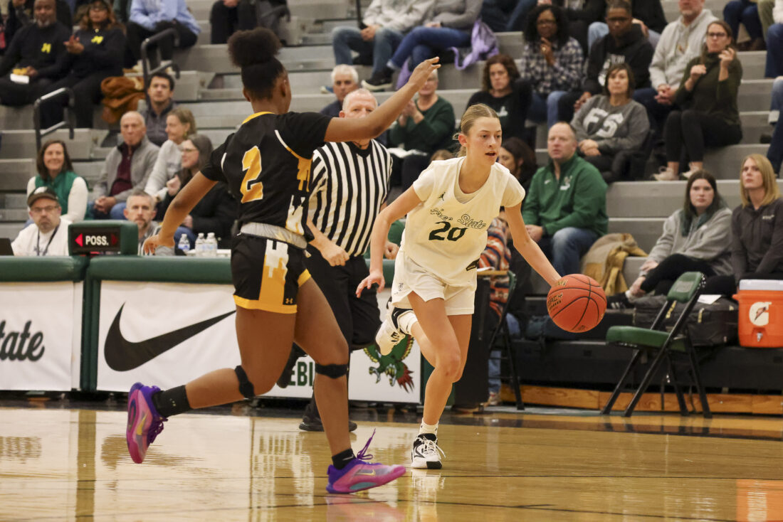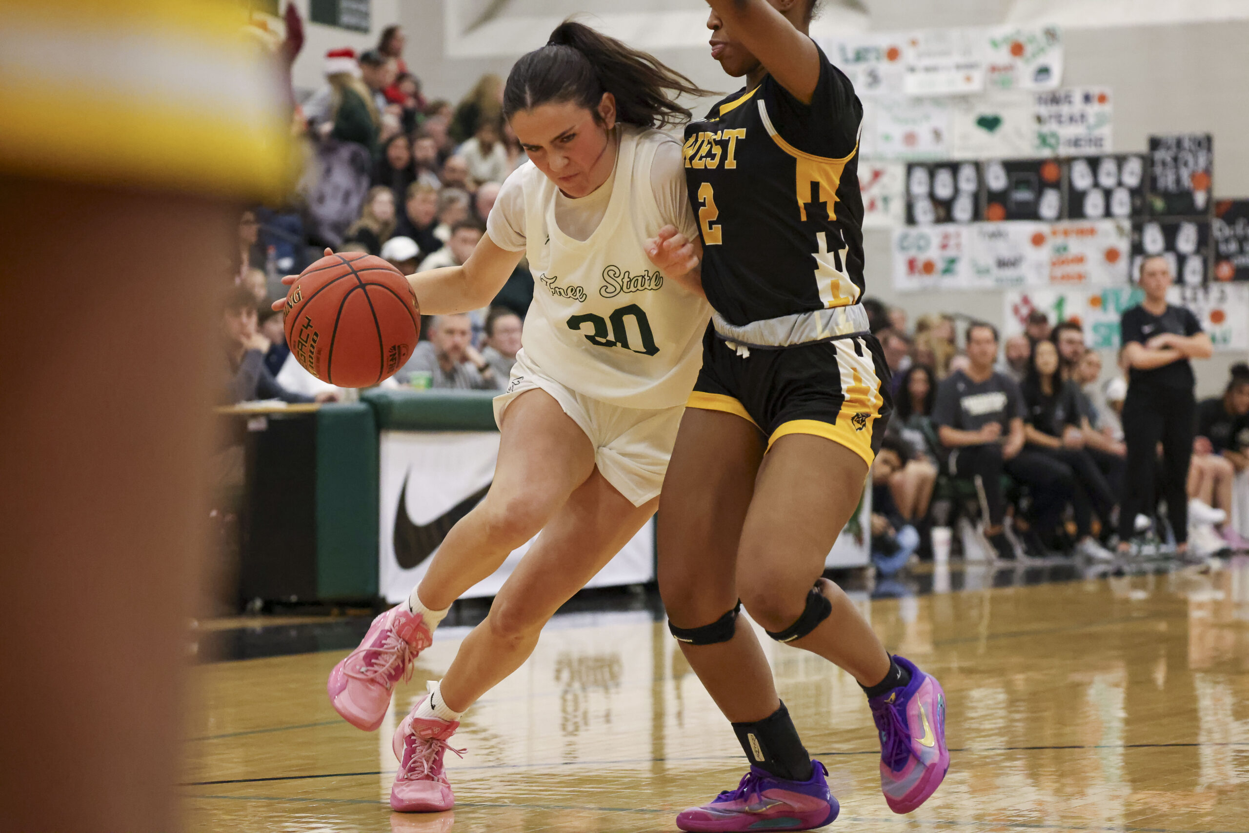 Free State freshman Taylor Hulcher looks to get past her defender during the Firebirds’ game against Shawnee Mission West on Friday, Dec. 19, 2025, at Free State High School in Lawrence.
