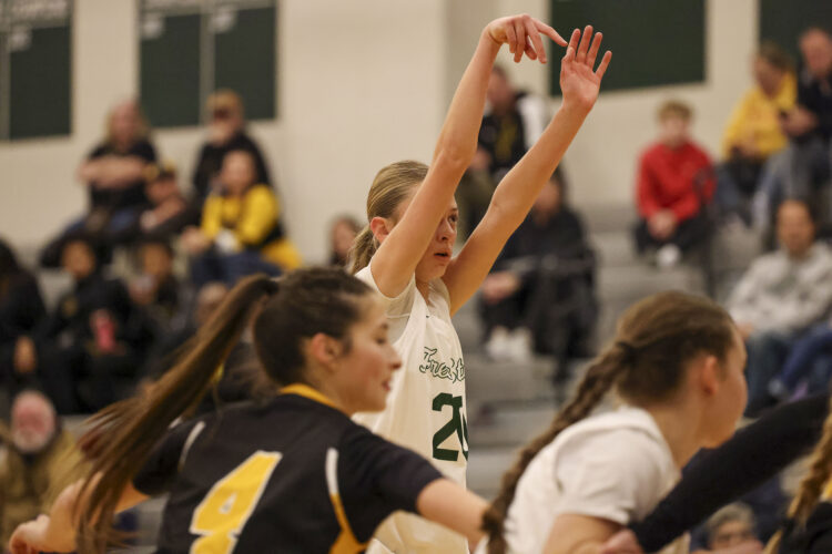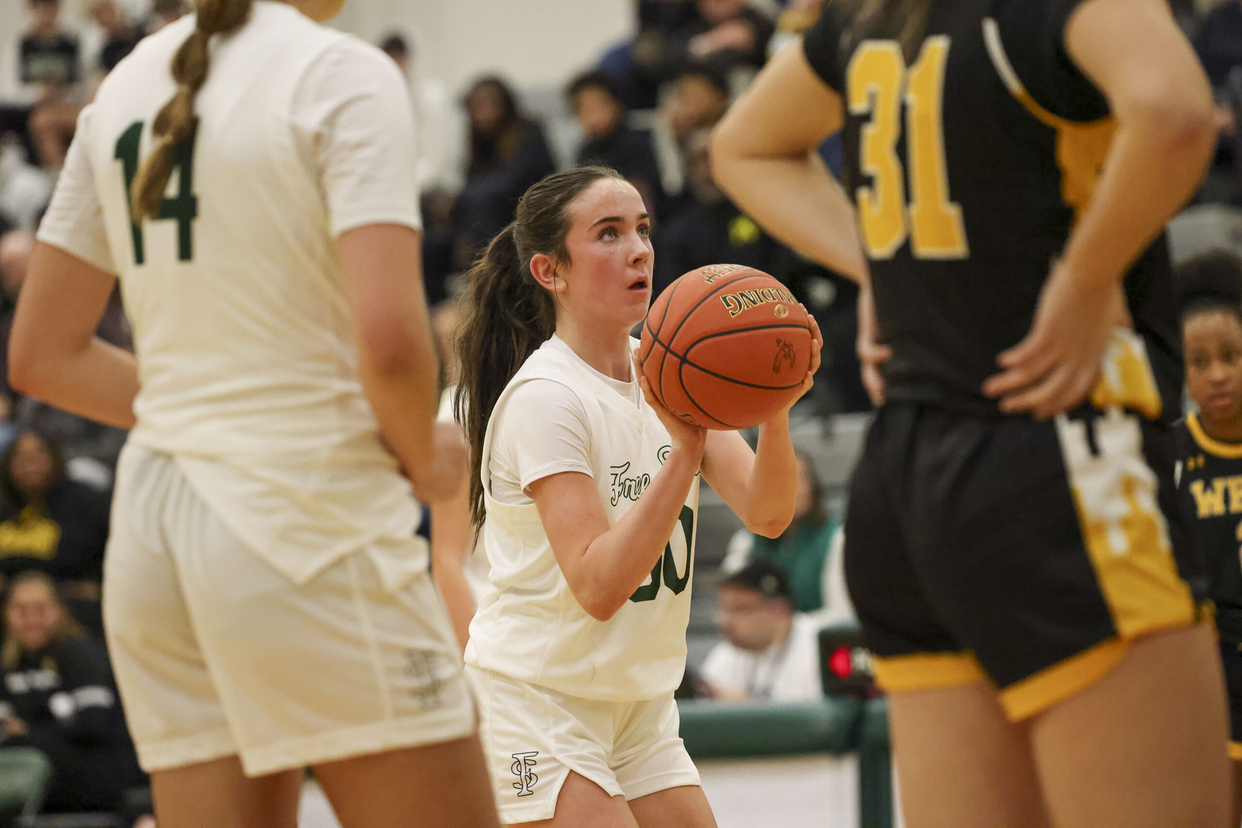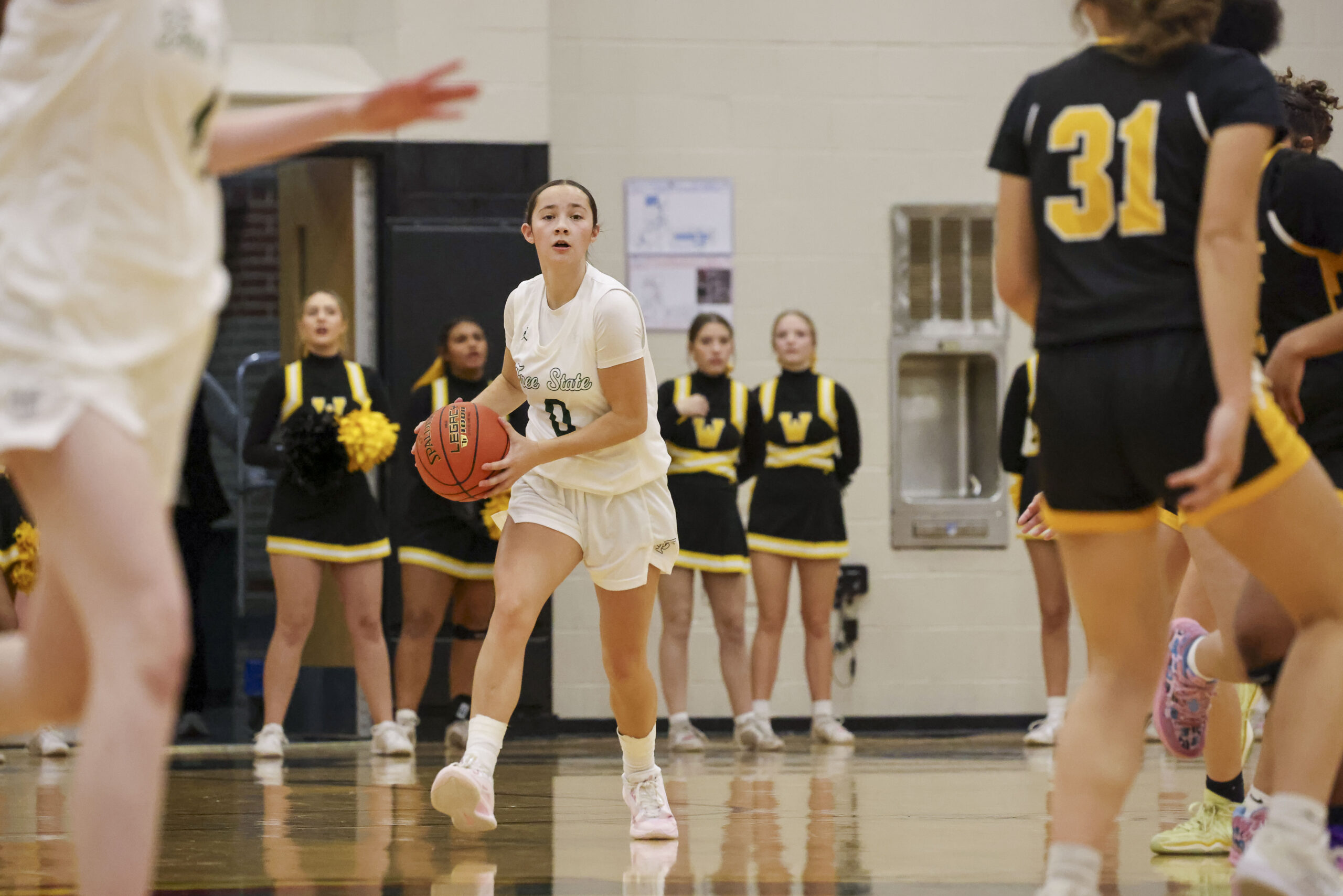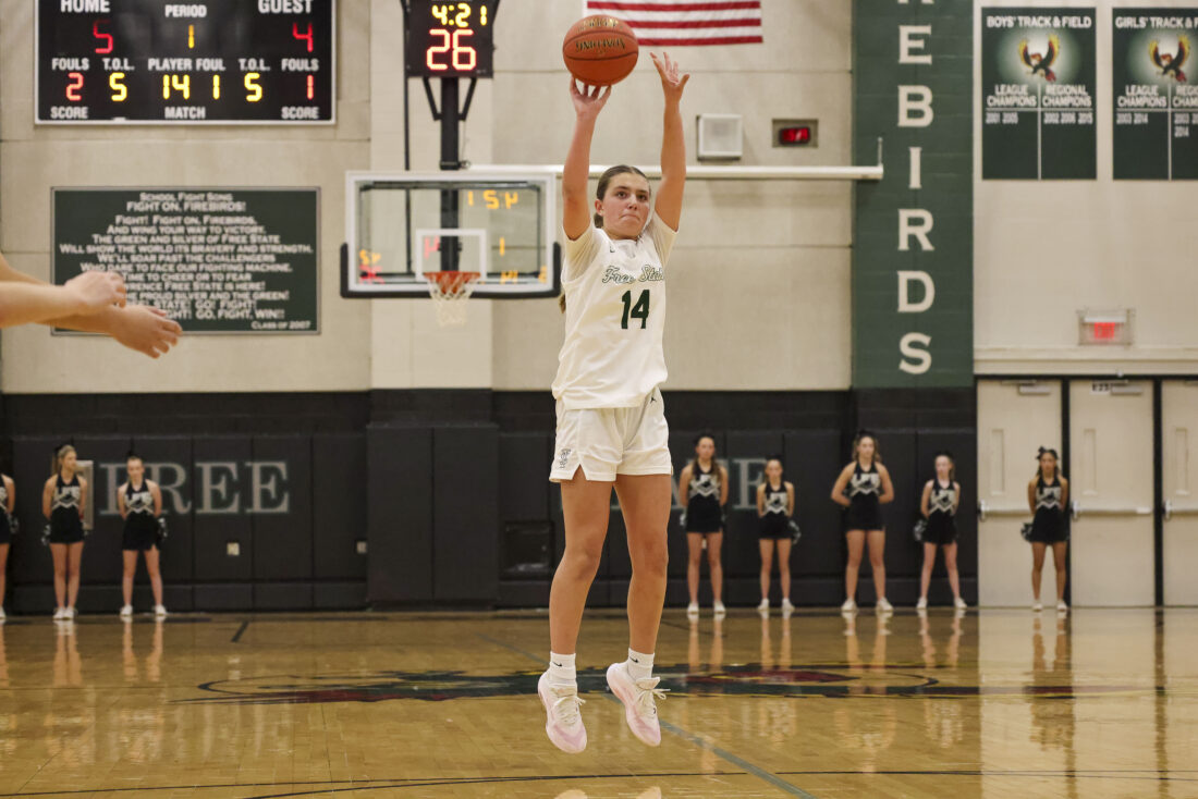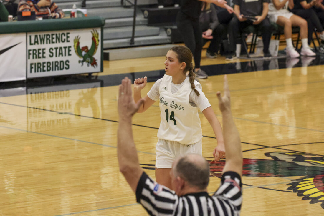 Free State freshman Quinlynn Vail drops back after a making a three during the Firebirds’ game against Shawnee Mission West on Friday, Dec. 19, 2025, at Free State High School in Lawrence.