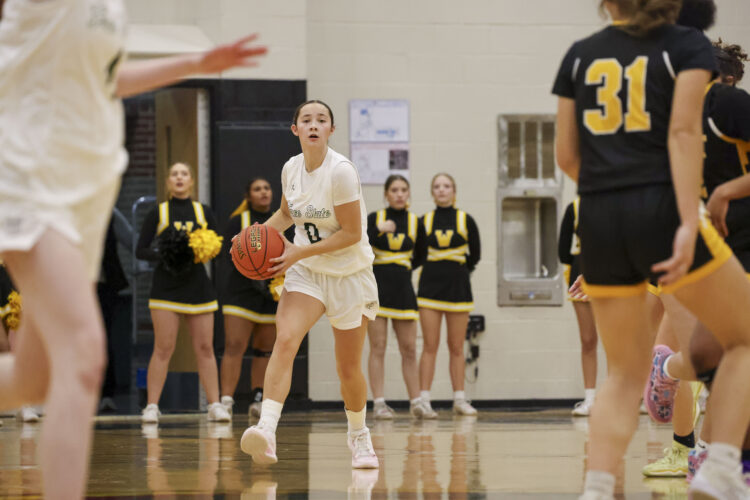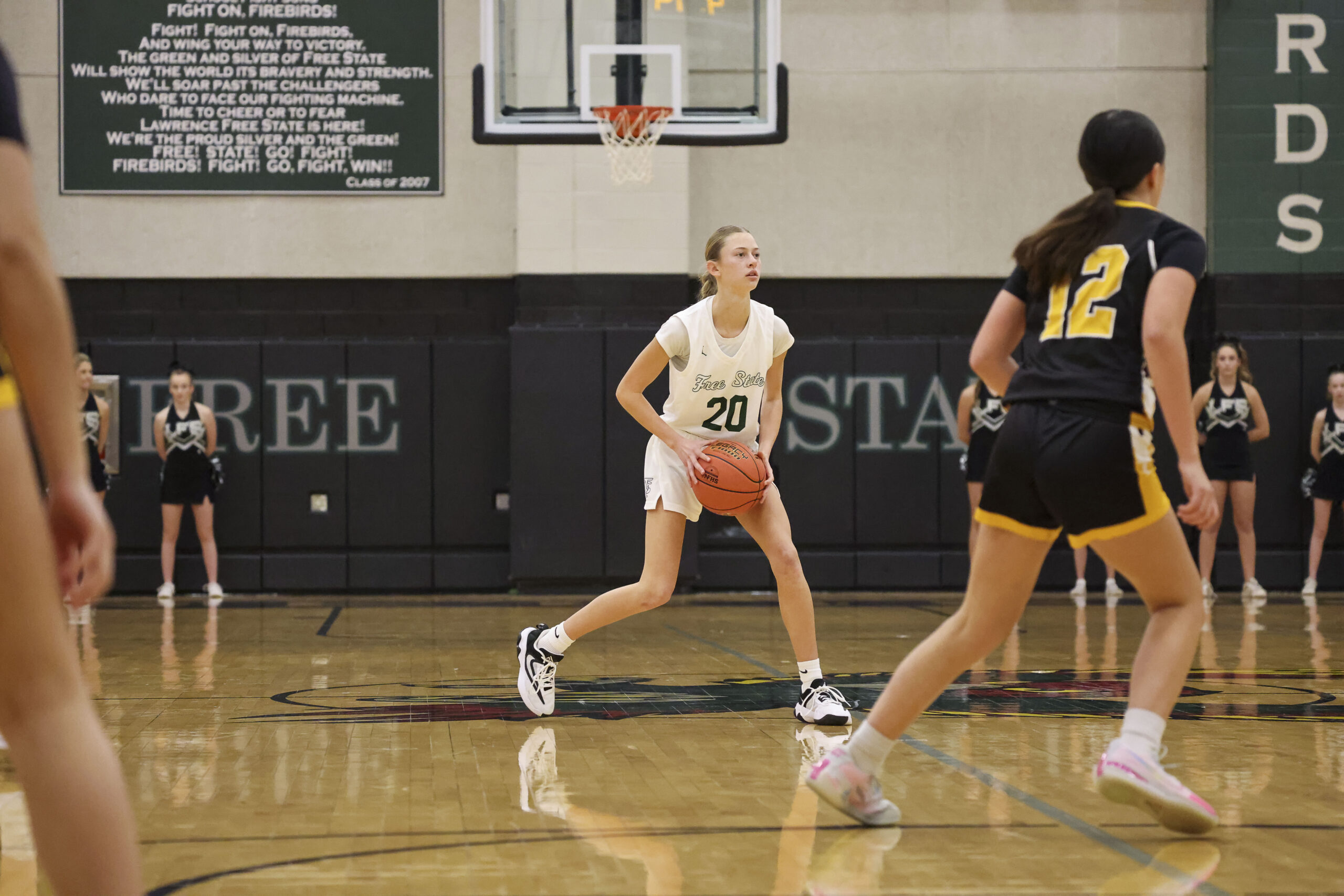 Free State freshman Morgan McClorey slides her feet to stay in front of a Shawnee Mission West ball handler during the Firebirds’ game against on Friday, Dec. 19, 2025, at Free State High School in Lawrence.