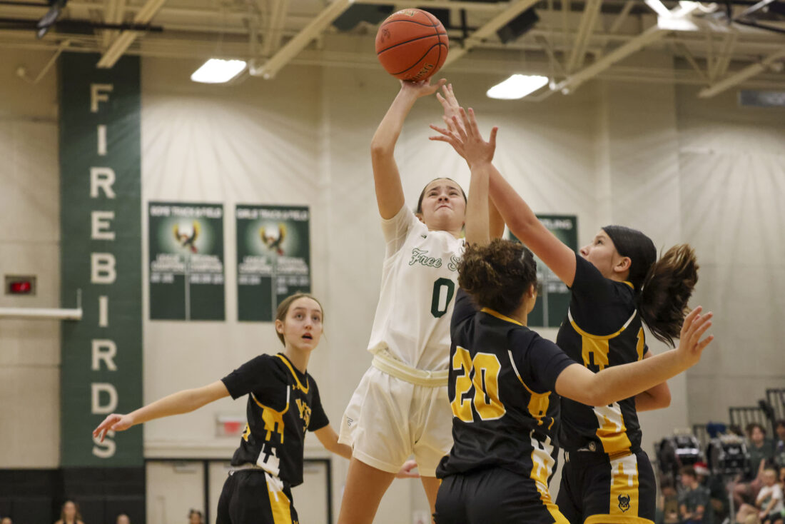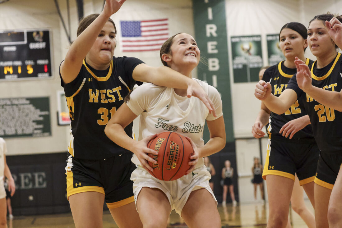 Free State senior Addie Fulscher is hit as she goes up for a shot during the Firebirds’ game against Shawnee Mission West on Friday, Dec. 19, 2025, at Free State High School in Lawrence.