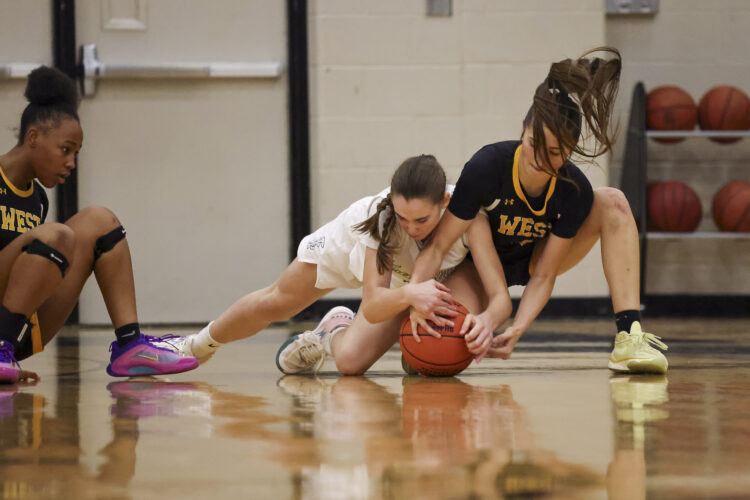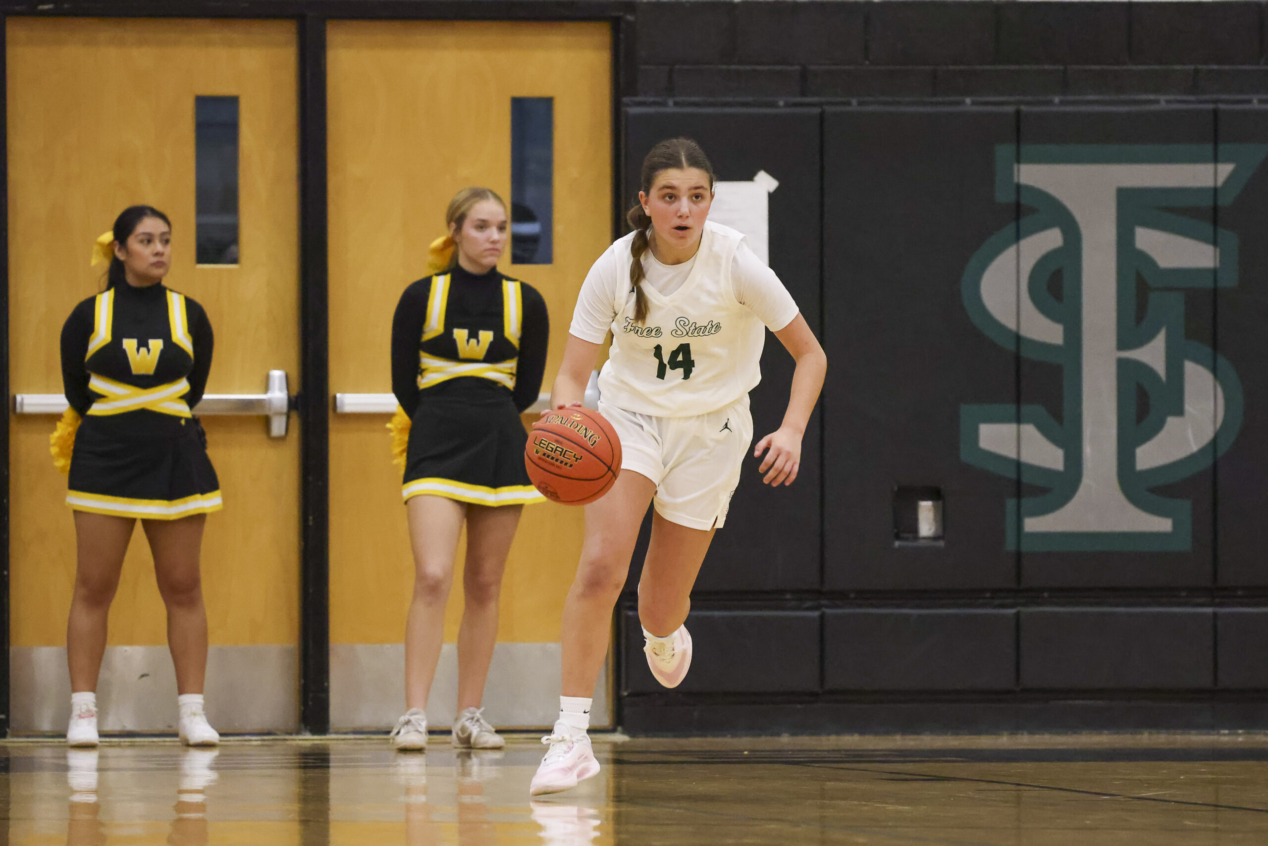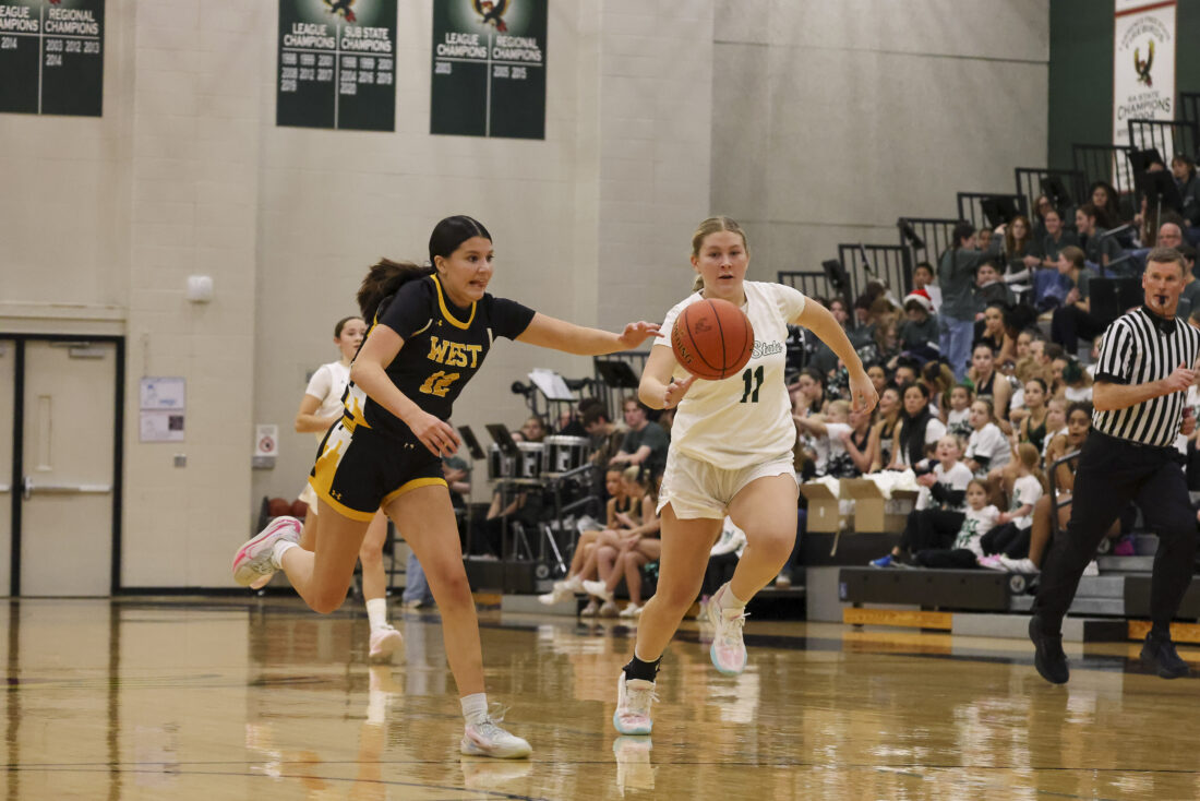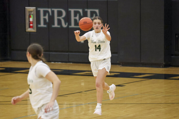 Free State senior Libby Easter chases down a loose ball during the Firebirds’ game against Shawnee Mission West on Friday, Dec. 19, 2025, at Free State High School in Lawrence.