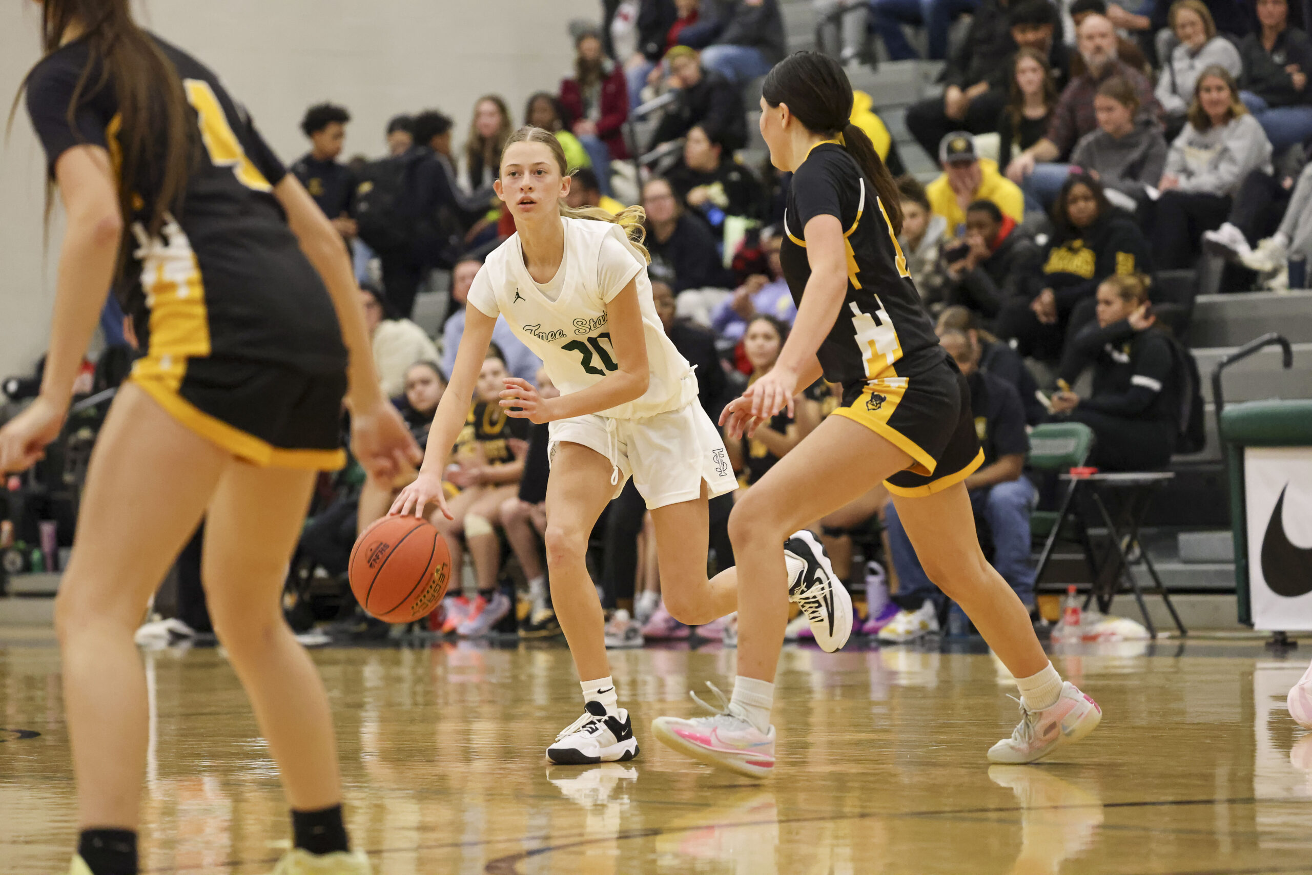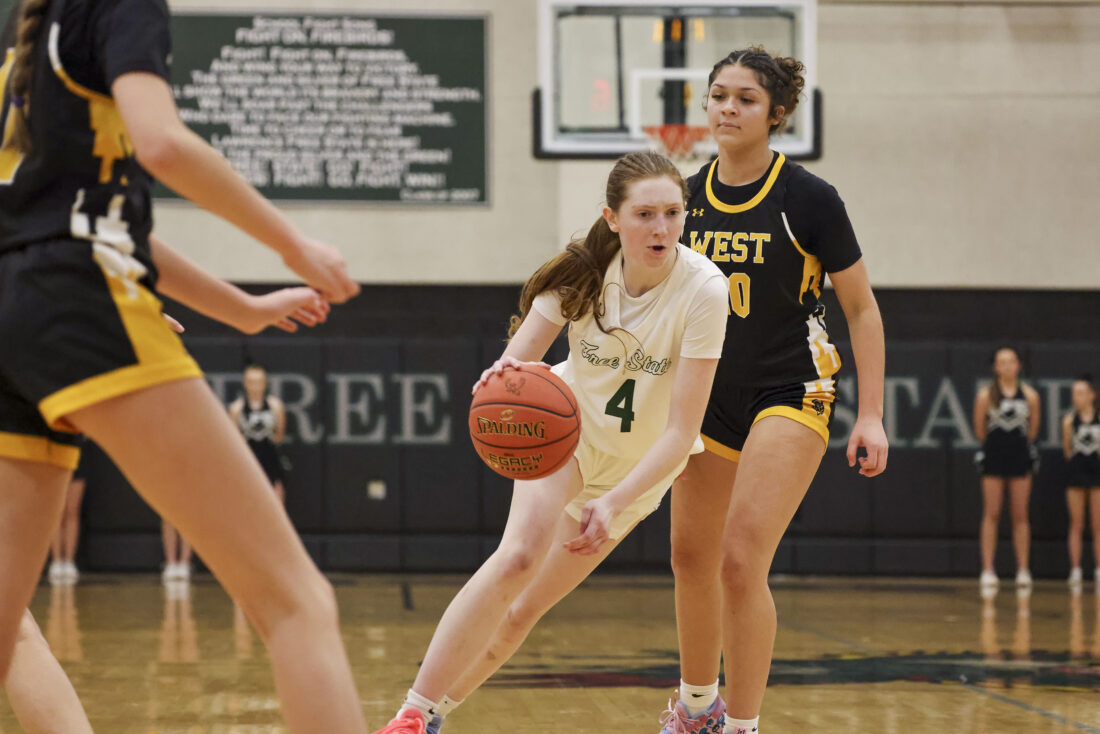 Free State junior Aedri Grooms defends an inbound pass during the Firebirds’ game against Shawnee Mission West on Friday, Dec. 19, 2025, at Free State High School in Lawrence.