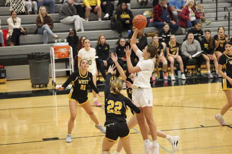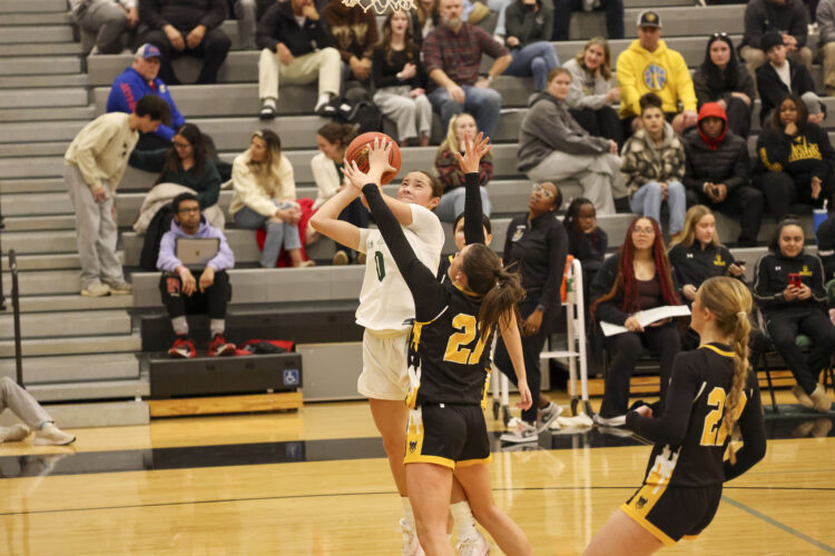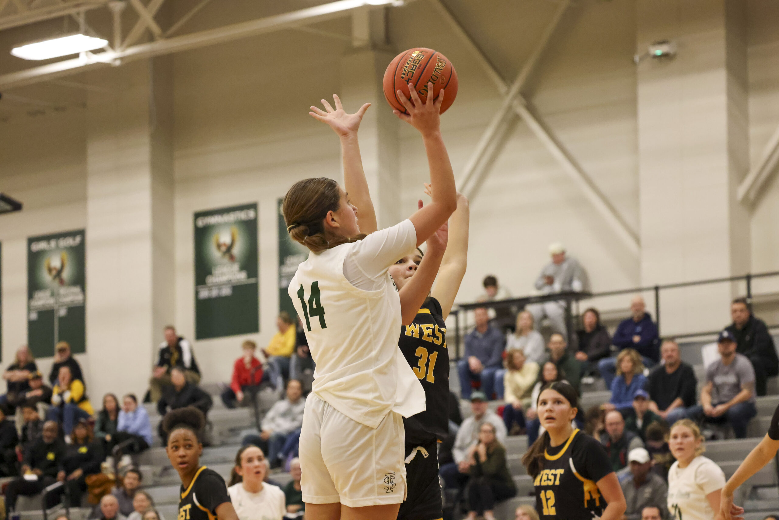 Free State senior Addie Fulscher goes up for a shot during the Firebirds’ game against Shawnee Mission West on Friday, Dec. 19, 2025, at Free State High School in Lawrence.