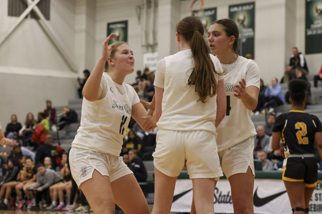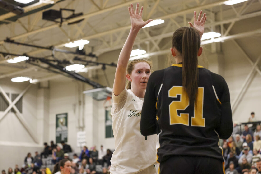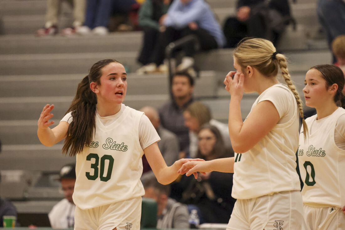 Free State freshman Morgan McClorey (30) chats with senior Libby Easter during the Firebirds’ game against Shawnee Mission West on Friday, Dec. 19, 2025, at Free State High School in Lawrence.
