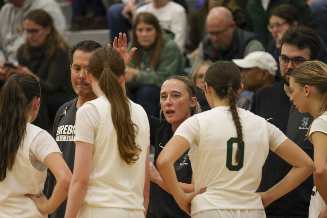 Free State head coach Summer Frantz speaks to her team during a timeout in the Firebirds’ game against Shawnee Mission West on Friday, Dec. 19, 2025, at Free State High School in Lawrence.