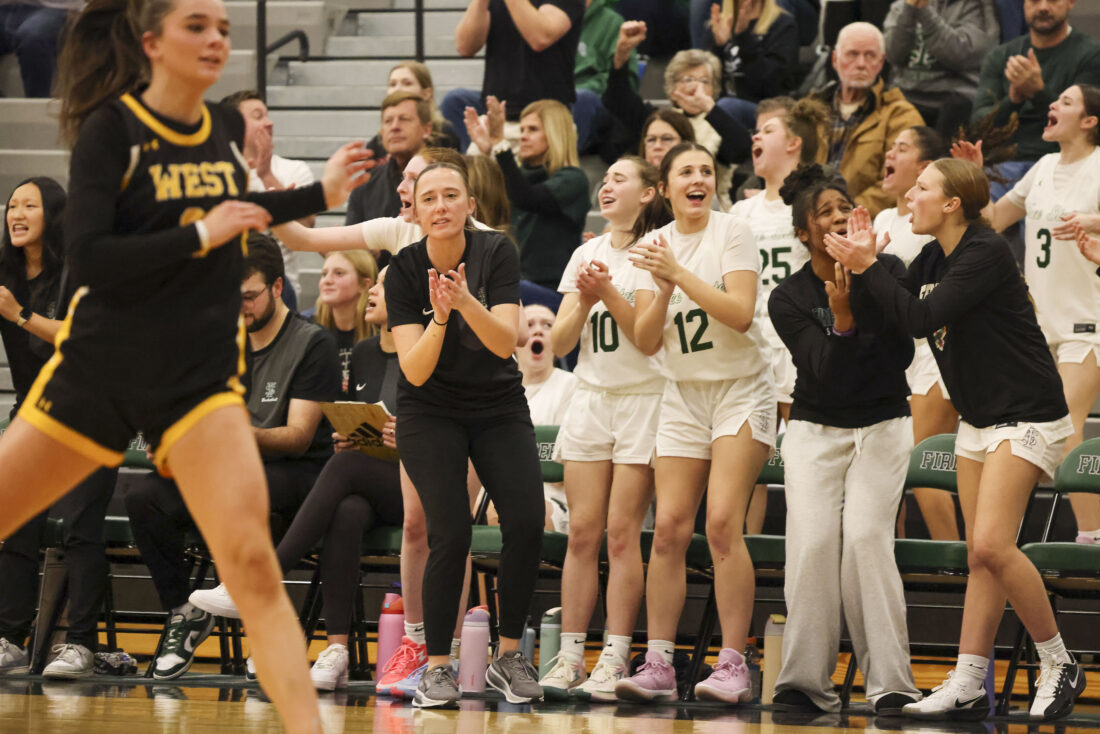 The Free State bench celebrates a basket during the Firebirds’ game against Shawnee Mission West on Friday, Dec. 19, 2025, at Free State High School in Lawrence.