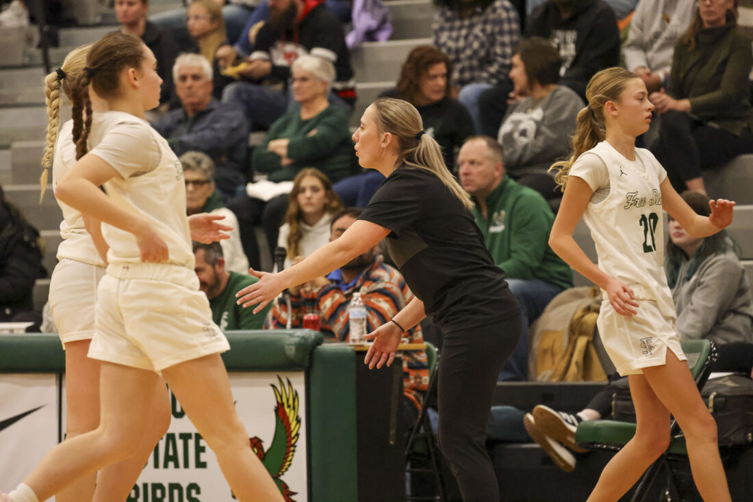 Free State head coach Summer Frantz welcomes her team back to the bench during the Firebirds’ game against Shawnee Mission West on Friday, Dec. 19, 2025, at Free State High School in Lawrence.