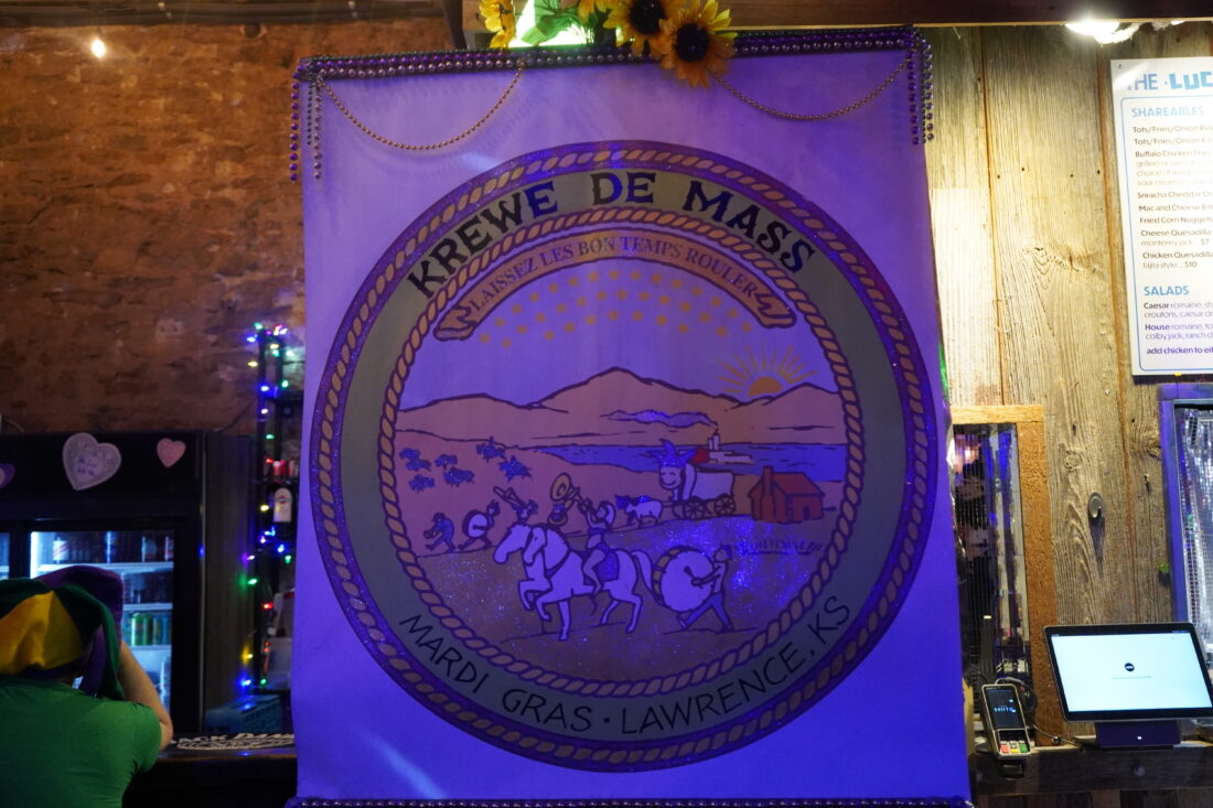 A banner for the Lawrence Mardi Gras celebration in Lucia on Tuesday, Feb. 17, 2026.