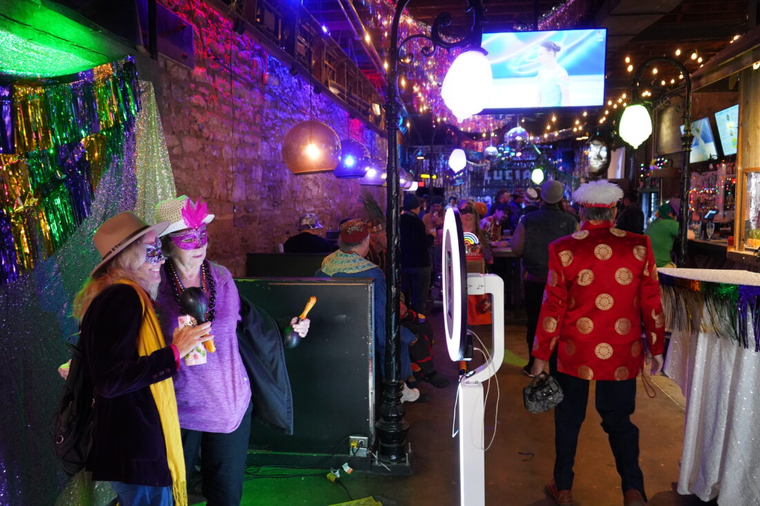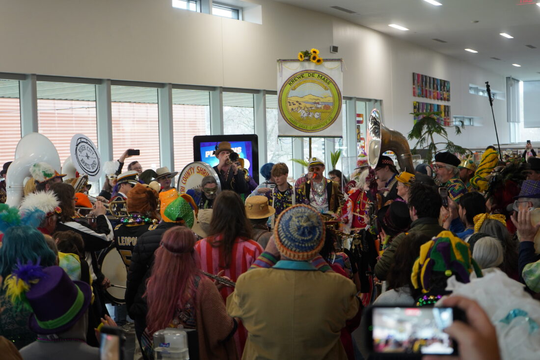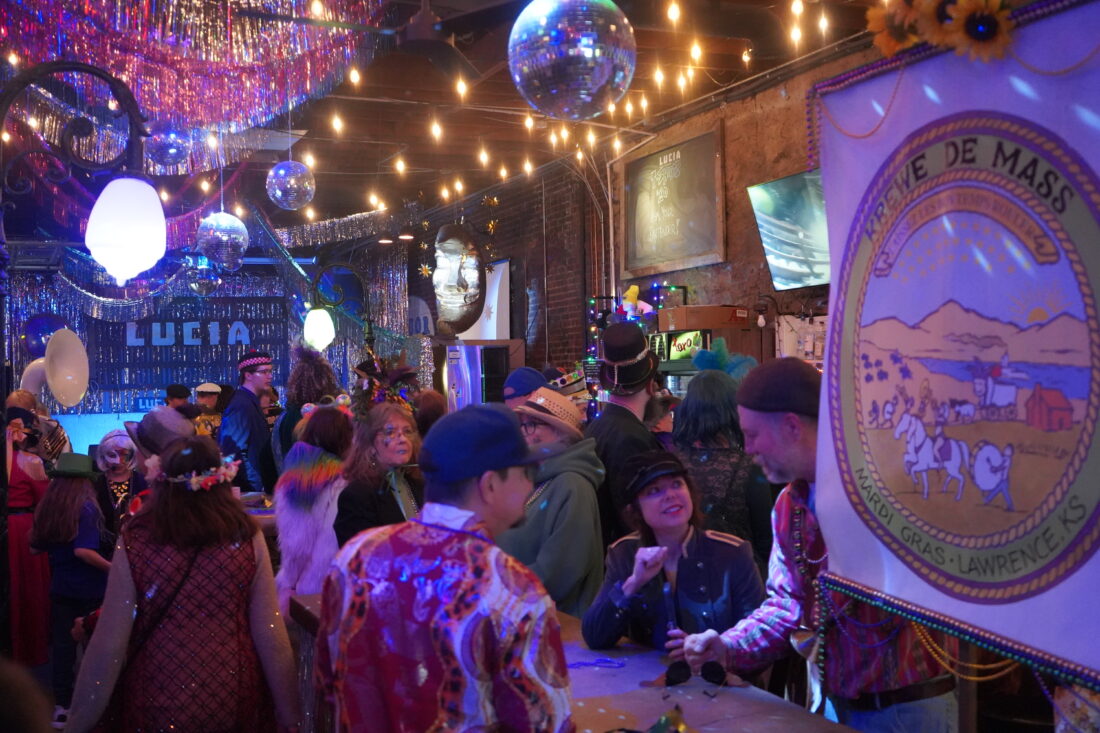 Participants in the Lawrence Mardi Gras gather in Lucia on Tuesday, Feb. 17, 2026.
