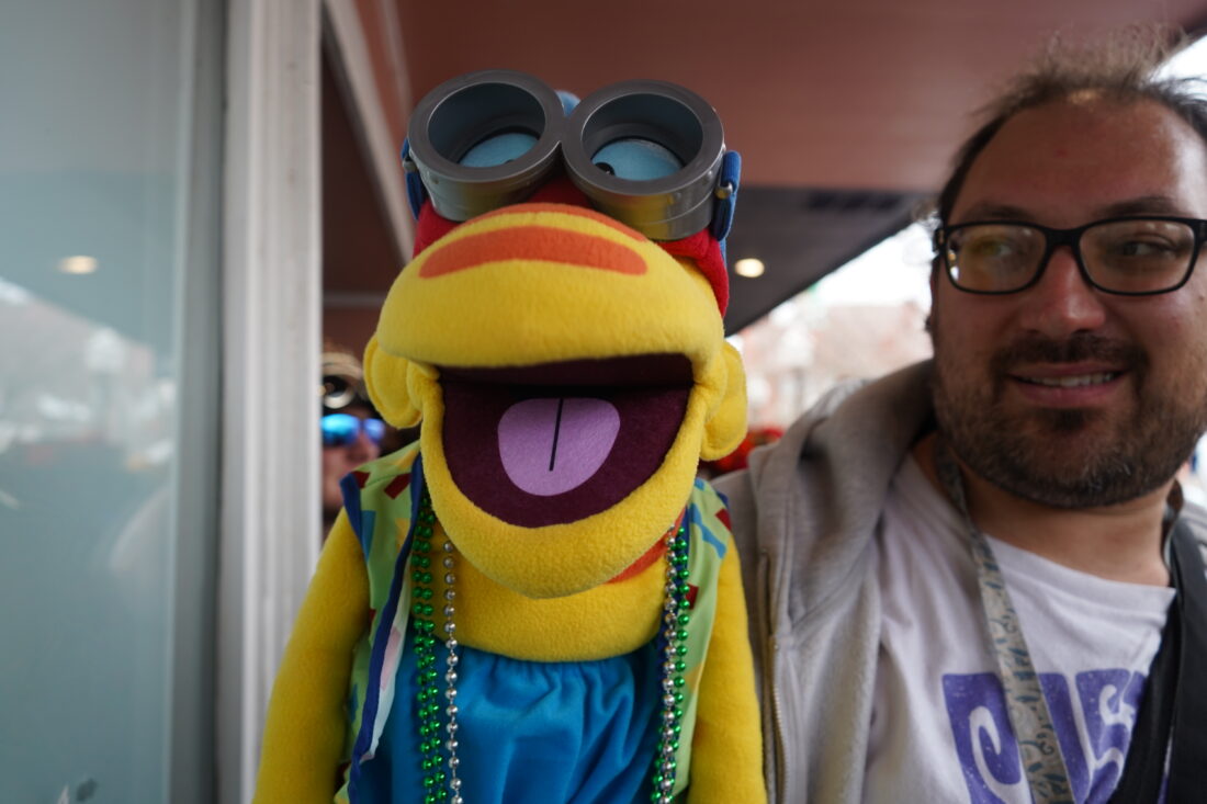 A parade participant with a hand puppet outside of Lucia on Tuesday, Feb. 17, 2026