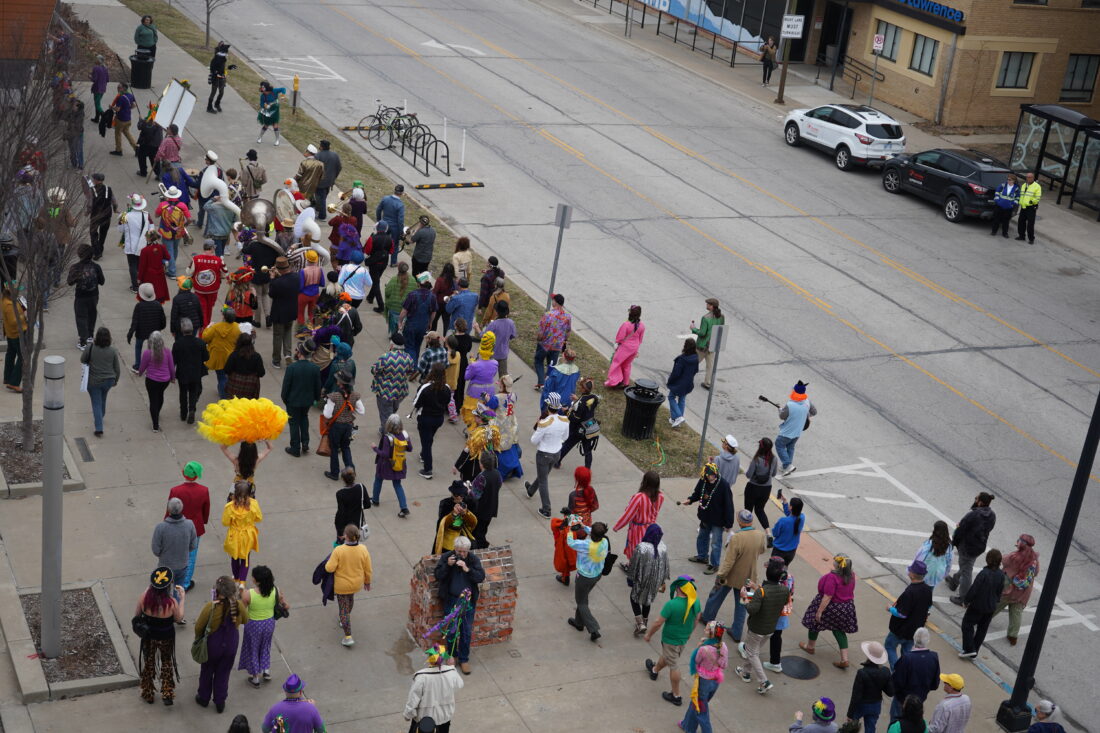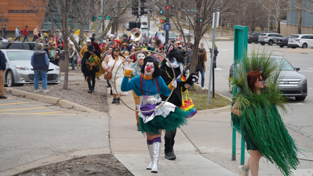 Lawrence Mardi Gras participants pass by the Lawrence Public Library on Tuesday, Feb. 17, 2026.