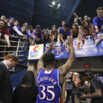 Kansas center Udoka Azubuike (35) reaches to high five the students as he leaves the court following the Jayhawks' 77-69 win over the Mountaineers, Saturday, Feb. 17, 2018 at Allen Fieldhouse.