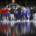 The Kansas Jayhawks come in for a team huddle toward the beginning of practice on Thursday, March 22, 2018 at CenturyLink Center in Omaha, Neb.