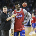 Kansas head coach Bill Self gives a pat on the chest to Kansas center Udoka Azubuike (35) at the conclusion of the Jayhawks' practice on Wednesday, March 14, 2018 at Intrust Bank Arena in Wichita, Kan.