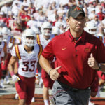 Second-year Iowa State head coach Matt Campbell leads his Cyclones onto the field in Norman, Oklahoma, Saturday before they upset No. 3 Oklahoma, 38-31. (Associated Press photo.)