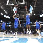 The Kansas big men work in the post on Wednesday, March 20, 2019 at Vivint Smart Home Arena in Salt Lake City, Utah. Teams practiced and gave interviews to media members before Thursday's opening round games.