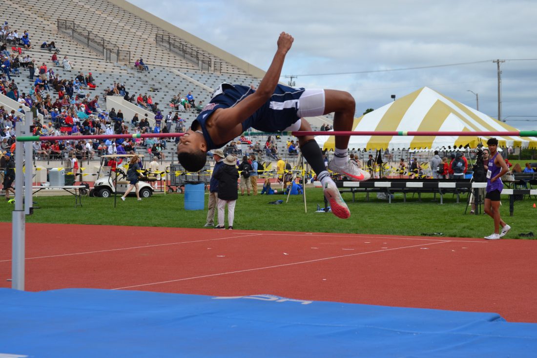 Eudora sophomore Jaiden Bender leaps in the air in the boys high jump competition during the state track meet on Friday at Cessna Stadium at Wichita State University in Wichita on May 28, 2021.