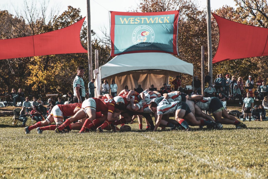 A scrum is formed between Iowa State and Kansas during the Heart of America semifinal game at Westwick Rugby Complex on Nov. 7, 2021. (Photo courtesy of Griff Hastings)