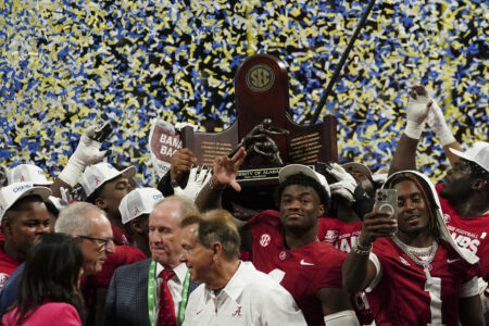 Alabama quarterback Jalen Milroe (4) center and the team holds up the championship trophy after the Southeastern Conference championship NCAA college football game against Georgia in Atlanta, Saturday, Dec. 2, 2023.