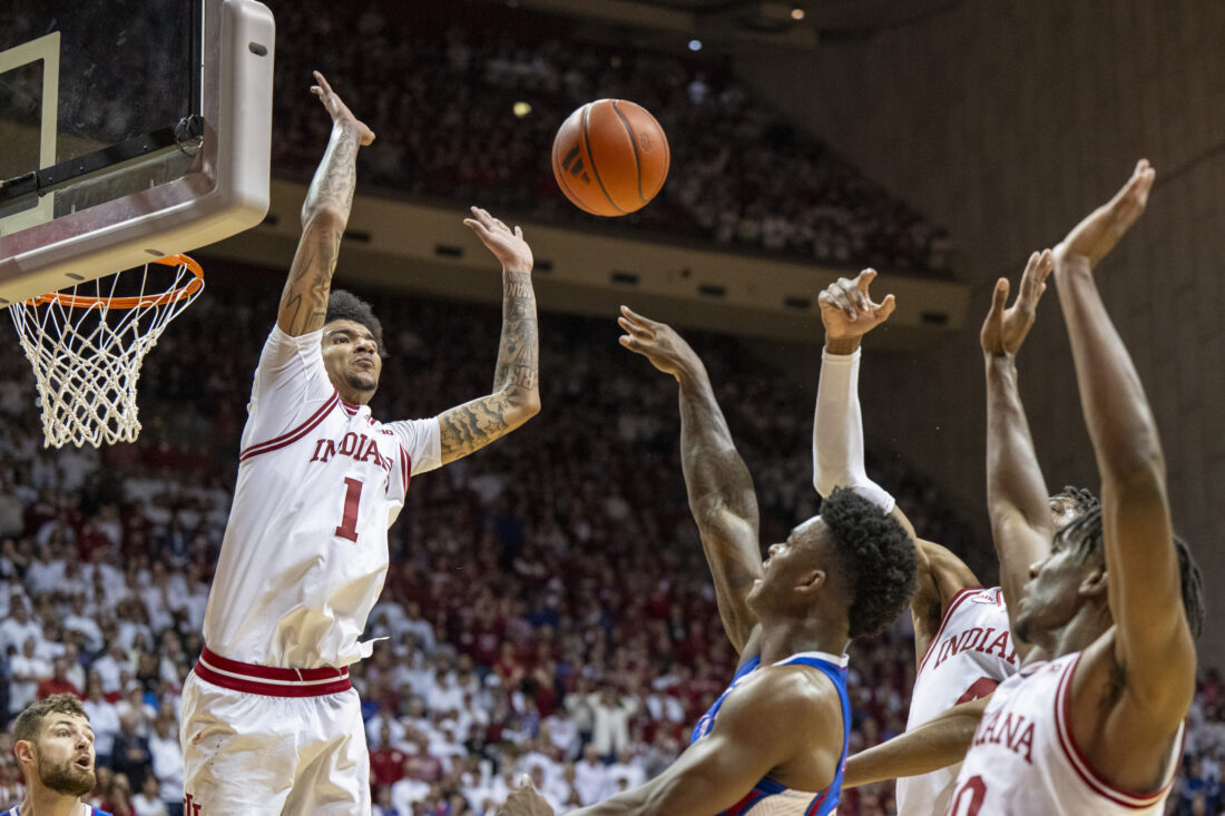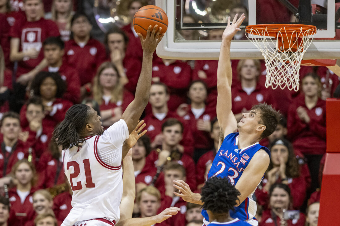 The Jayhawks drew as close as 12-11 on a McCullar 3 and a nice feed inside from Elmarko Jackson to Adams before IU scored six straight, highlighted by a hard-fought layup by Mgbako through a McCullar foul. A pair of turnovers in transition, however, prevented the Hoosiers from widening their advantage to double digits.