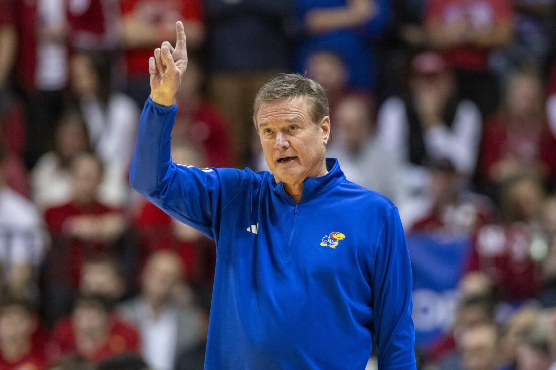 Kansas head coach Bill Self gestures during the first half of an NCAA college basketball game against Indiana, Saturday, Dec. 16, 2023, in Bloomington, Ind. (AP Photo/Doug McSchooler)