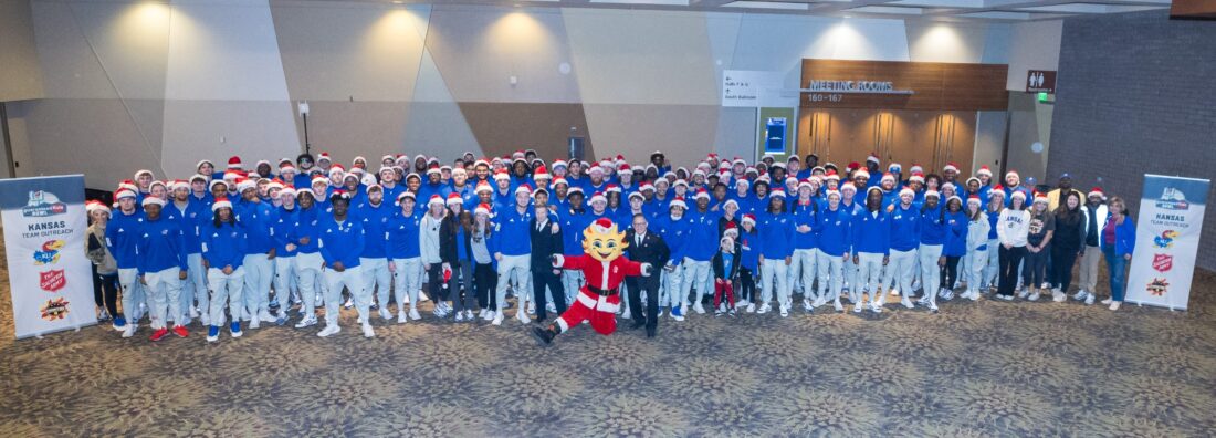 The Kansas football team poses for a group photo at its outreach event with the Salvation Army and the Guaranteed Rate Bowl in Phoenix on Monday, Dec. 25, 2023.