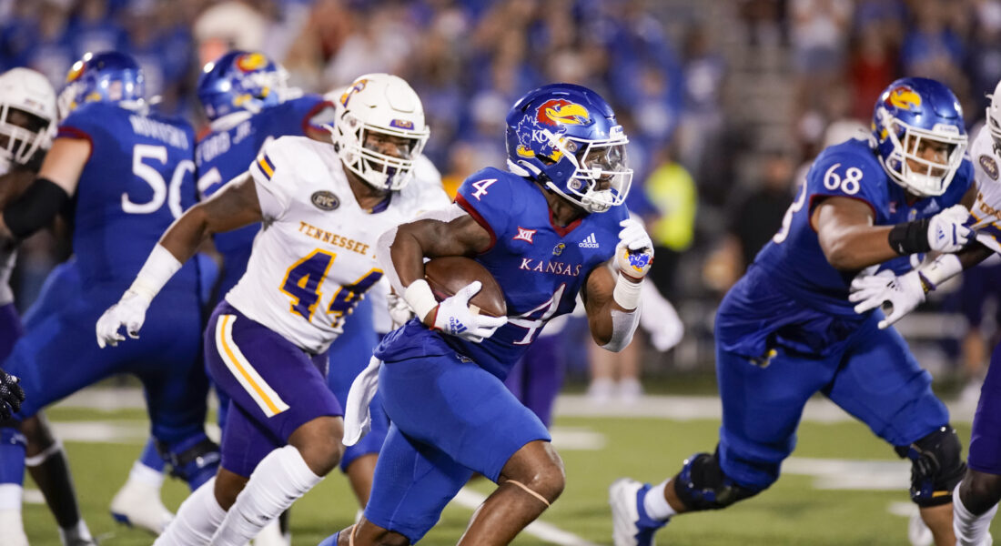 Kansas running back Devin Neal takes off on a long touchdown run against Tennessee Tech during the third quarter on Friday, Sept. 2, 2022, at Memorial Stadium.