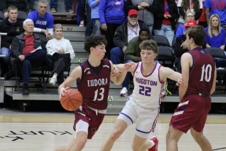 In the second quarter, Hugoton senior Ryle Riddlesperger kept the Eagles rolling with a second 3-pointer midway toward halftime. Eudora, trailing 26-13 at the half, kept the Eagles off the scoreboard during the final two minutes of the quarter.