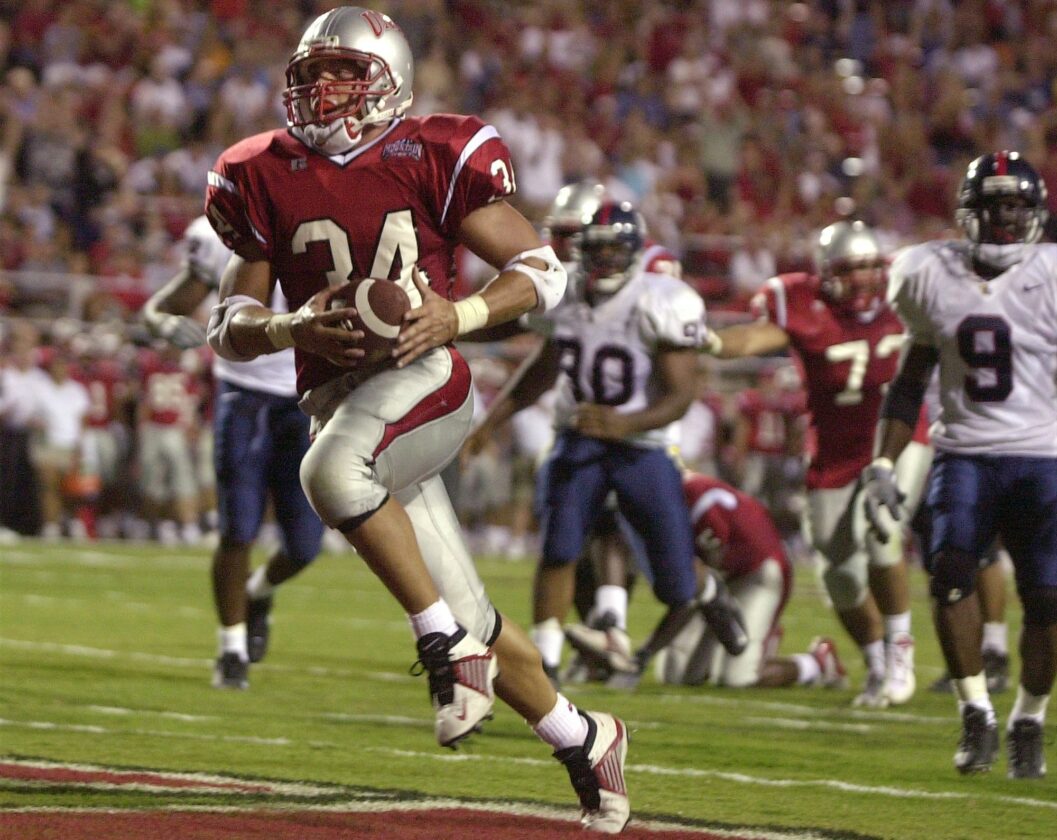 UNLV running back Joe Haro scores on an 8-yard touchdown run in the first quarter against Kansas on Saturday, Sept. 7, 2002, in Las Vegas. In the rear are Kansas’ Tim Allen (90) and Tony Stubbs.