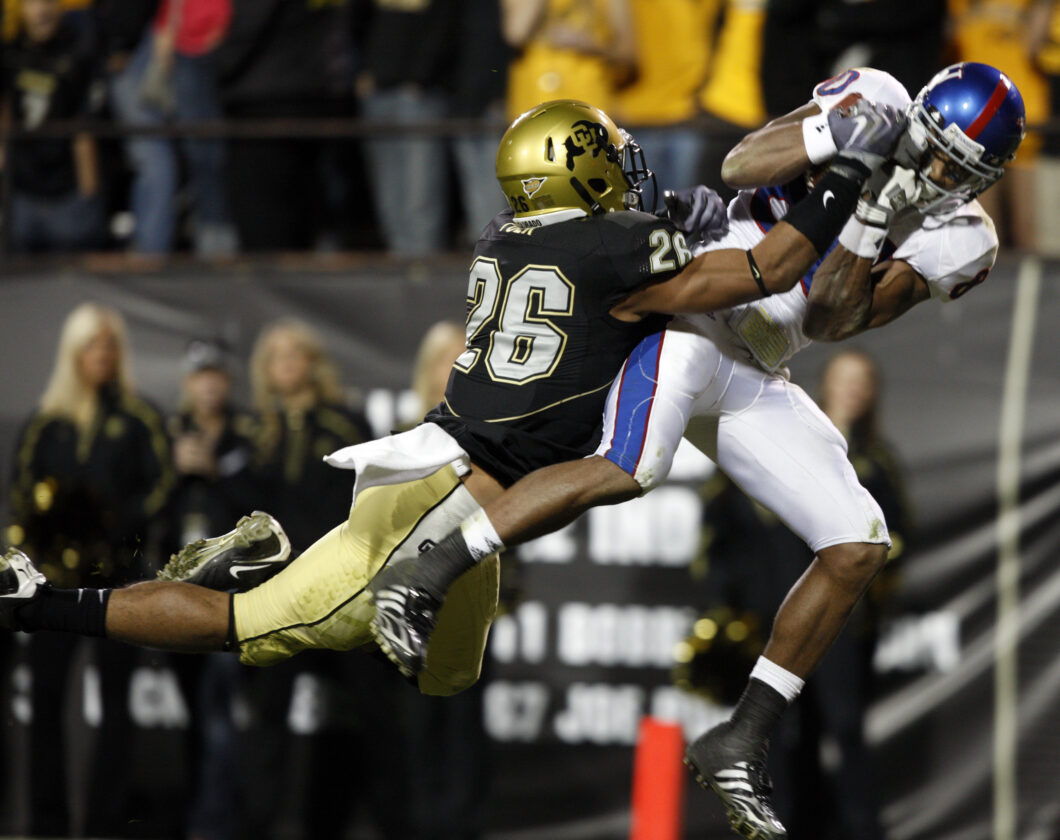 Kansas wide receiver Dezmon Briscoe, right, pulls in a pass for a touchdown as Colorado safety Ray Polk comes in to cover in the fourth quarter of Colorado’s 34-30 victory in an NCAA college football game in Boulder, Colo., on Saturday, Oct. 17, 2009.